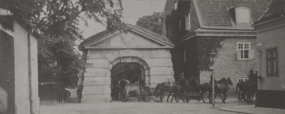 Titel: Artillerispann rider ut genom en före detta stadsport i Kristianstad.