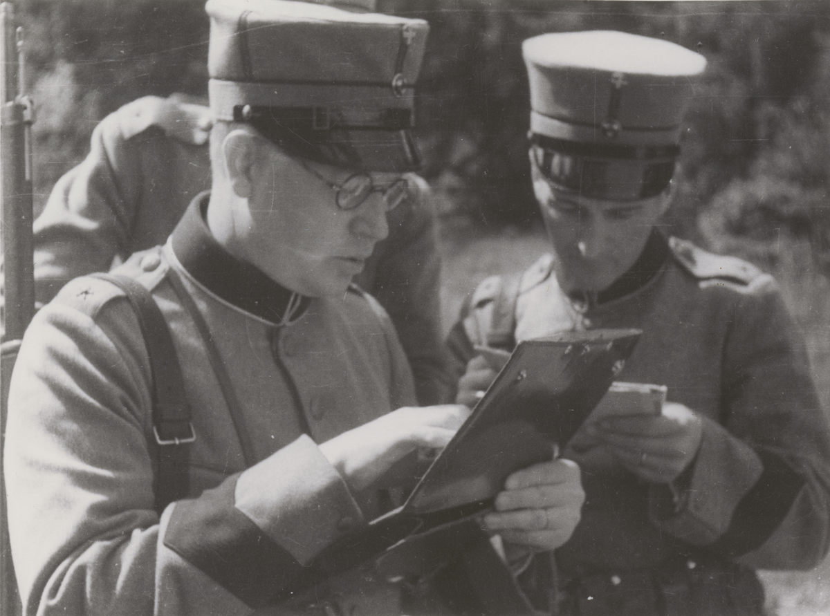 Två män ur FBU studerar anteckningar, iförda uniform m/1910 och skärmmössor, 1930-tal.