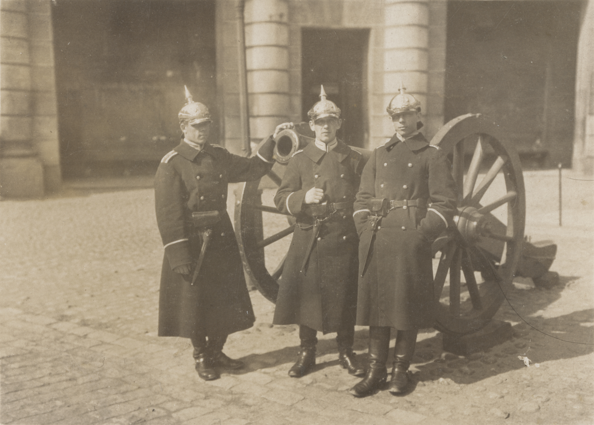 Titel: Tre man ur Livregementet till häst K 1 runt kanon vid högvaktsflygeln.
