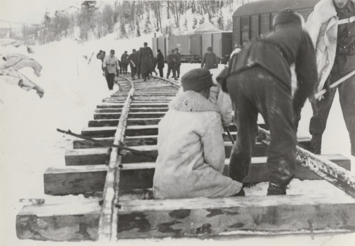 Luftvärnautomatkanontjänst vid järnväg, sannolikt Porjus vintertid ca 1945.