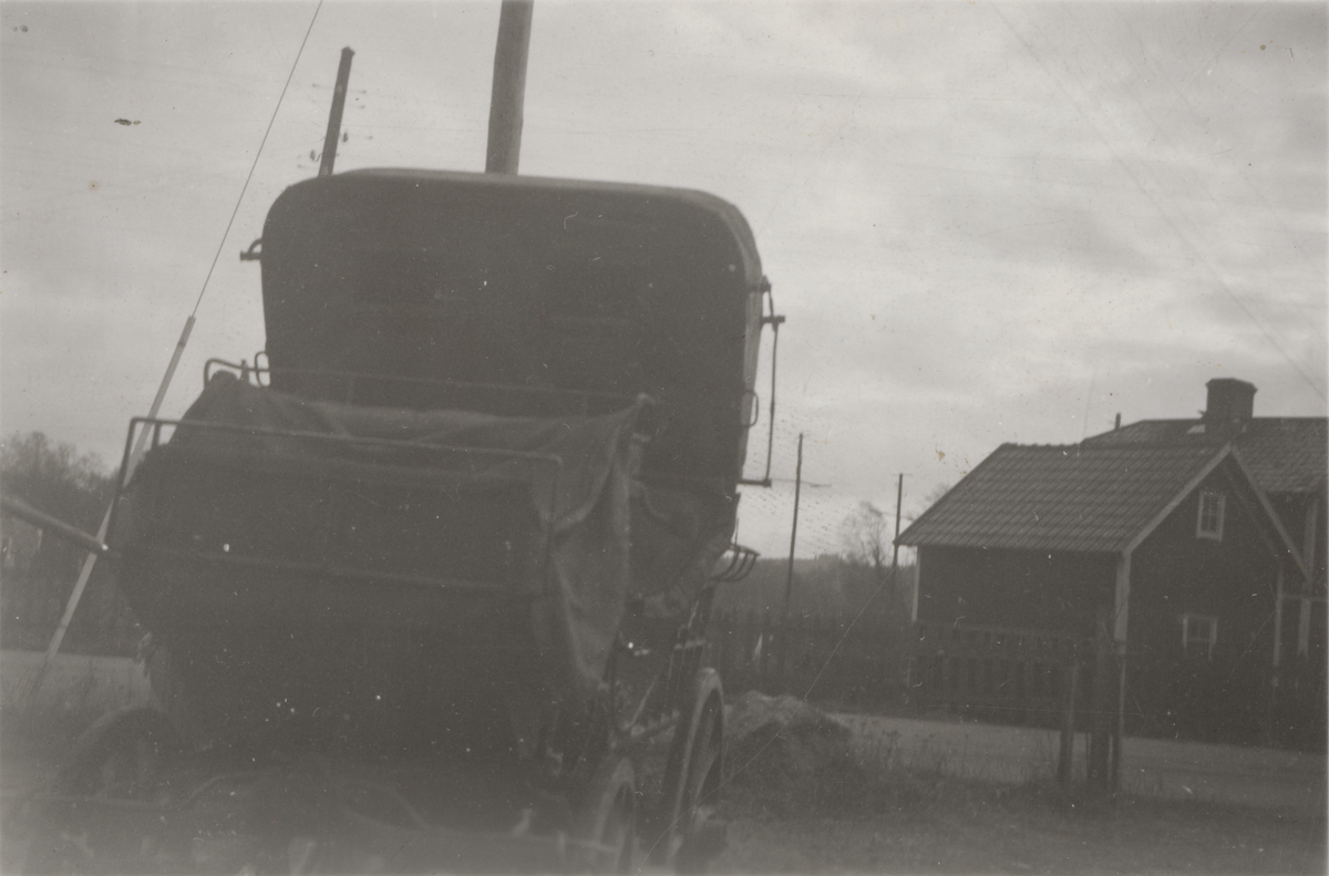 Titel: Intendenturdroska från Kalmar regemente utanför en stuga.