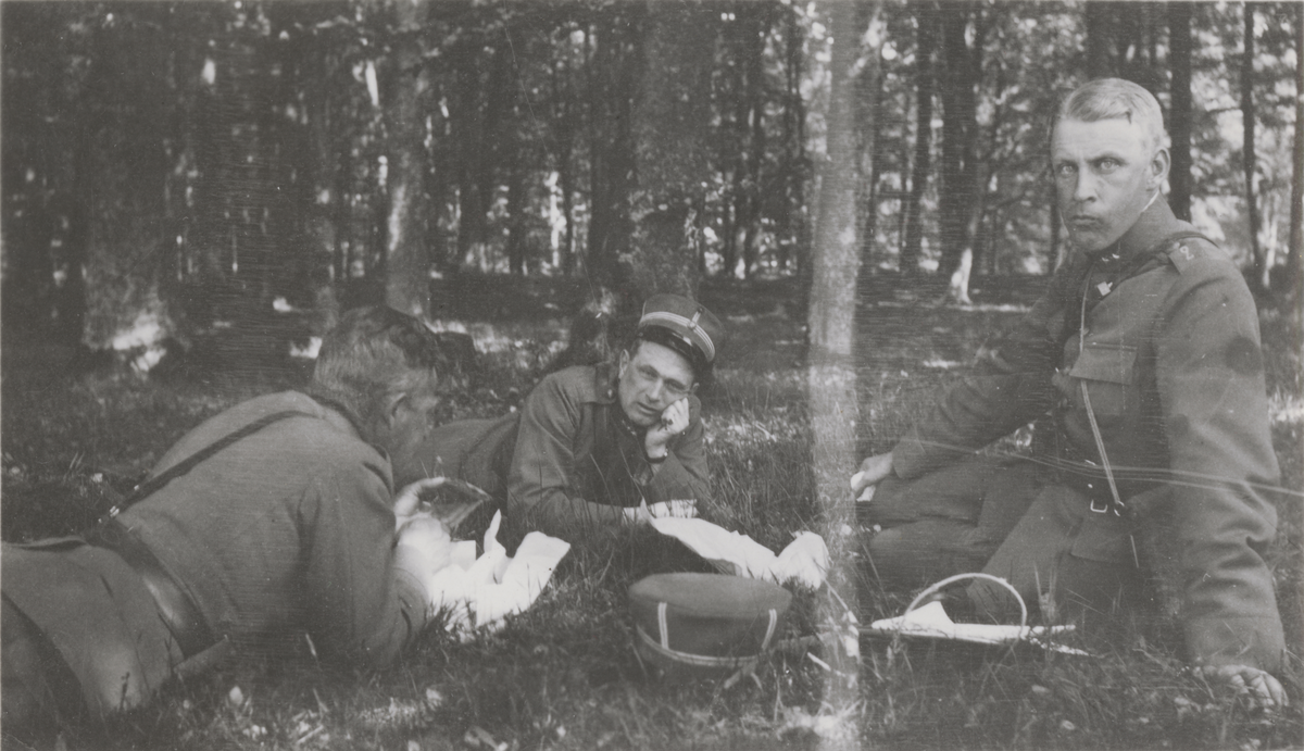 Titel: Tre soldater vilar i skogen med kartor framför sig.
