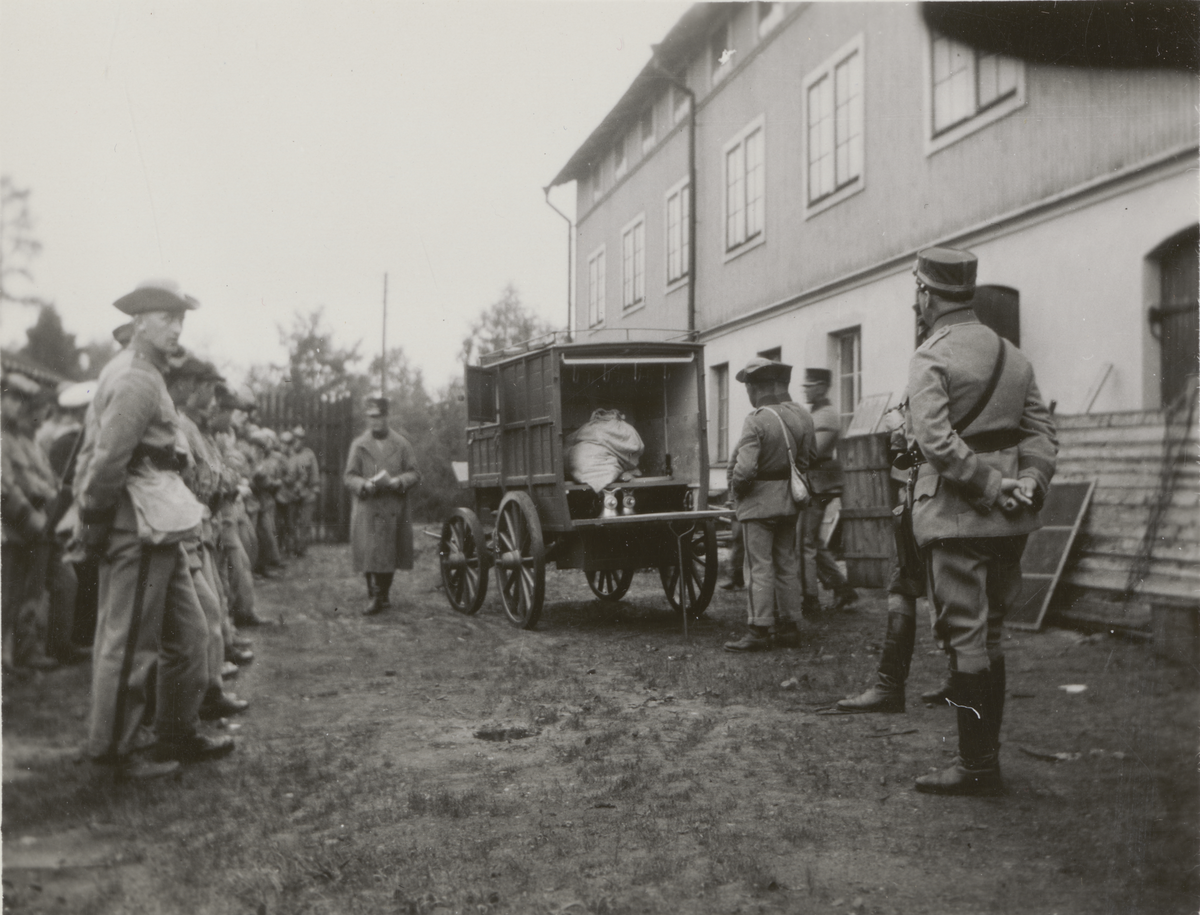 Titel: MFK Rommehed soldater i uniform m/1910 framför ett hus.