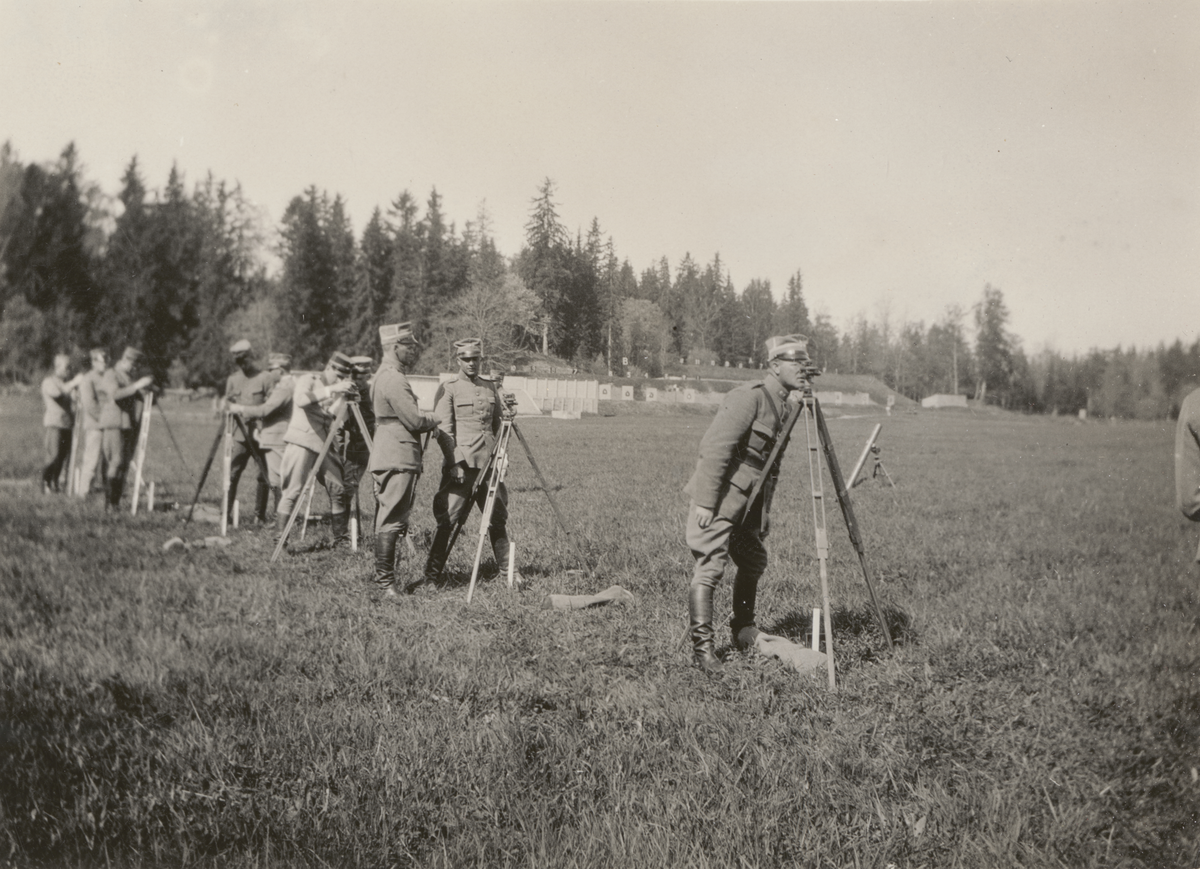 Titel: Infanteriskjutskolan Rosersberg officerare tittar genom kikare på trefot.