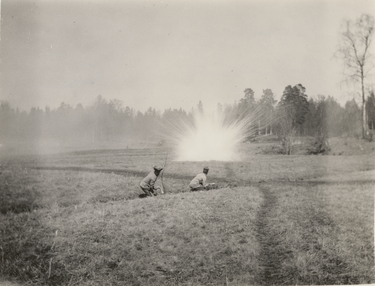 Titel: Infanteriskjutskolan Rosersberg Peyron kastar rökhandgranater.