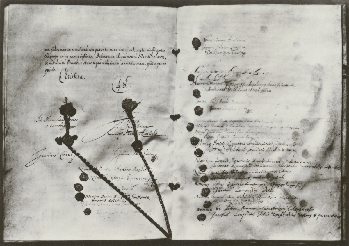 Vykort från minnesutställning om Westfaliska freden 1648, Livrustkammaren och Nordiska museet, 1948.