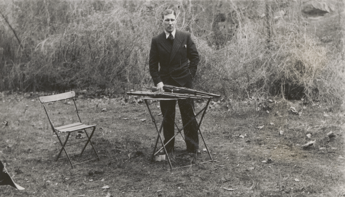 Civilklädd man med flera Mausergevär på bord i terräng, foto ur anonym serie bilder från beredskapen.