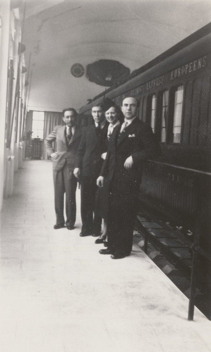 Titel: Tre män och en kvinna i en korridor med järnvägsvagn.