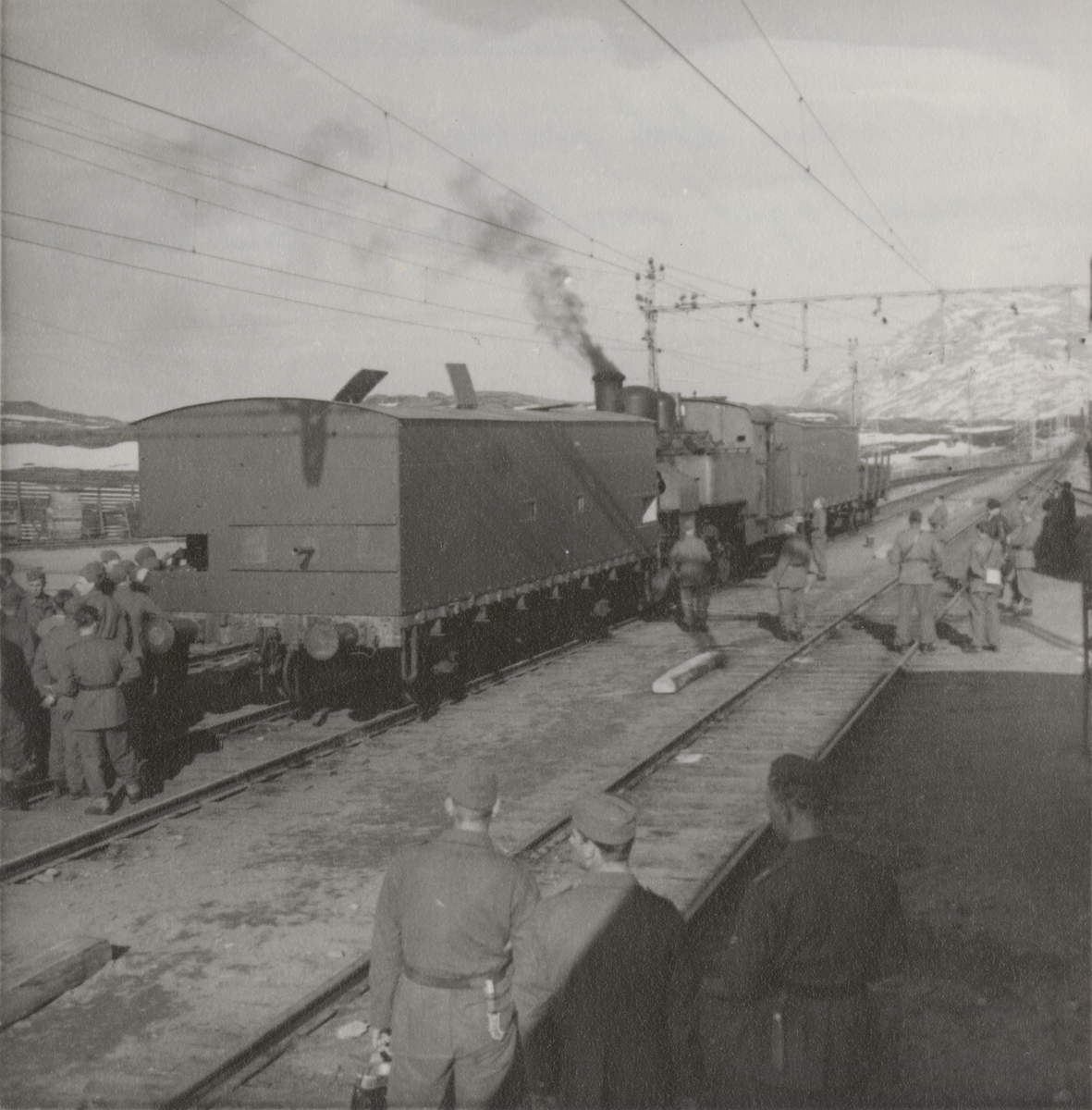 Det första svenska pansartåget betraktas av nyfikna soldater. Foto ur anonym serie från beredskapen i Norrland.