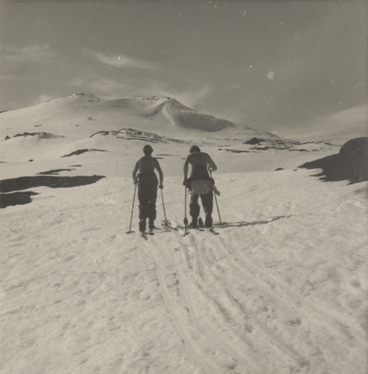 Två skidåkare med bar överkropp på väg mot Vassijokkos topp. Foto ur anonym serie från beredskapen i Norrland.