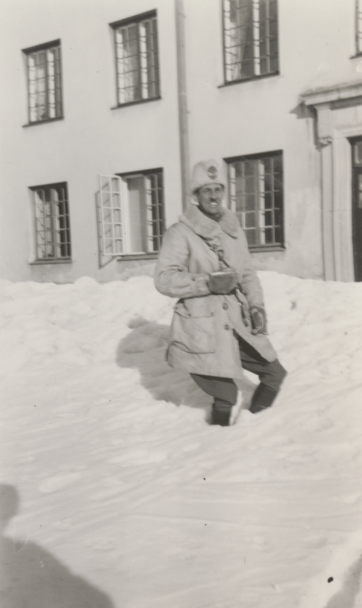 Man i vintermundering sitter på ett snöblock utanför ett stenhus. Foto ur anonym serie från beredskapen i Norrland.