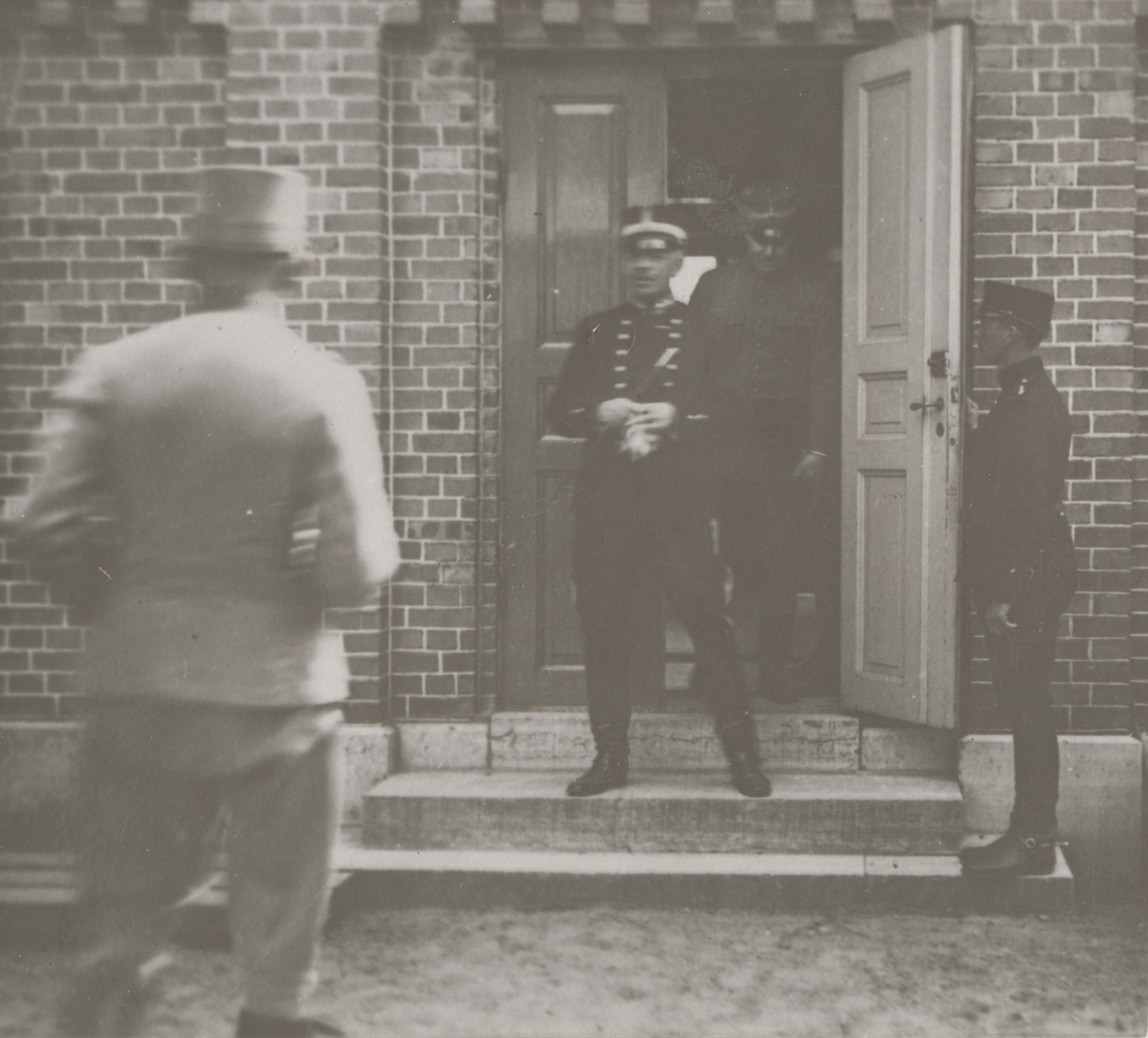 Titel: Officerare i dörröppning till tegelbyggnad på Karlsborgs fästning.