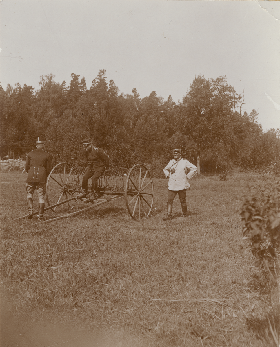 Överstelöjtnant O. W. Melin (Skaraborgs regemente I 9, chef för infanteriskjutskolan), major von Hedenberg (Västerbottens regemente I 20) och major T. Munck (Norra skånska regementet I 24) kring en harv.