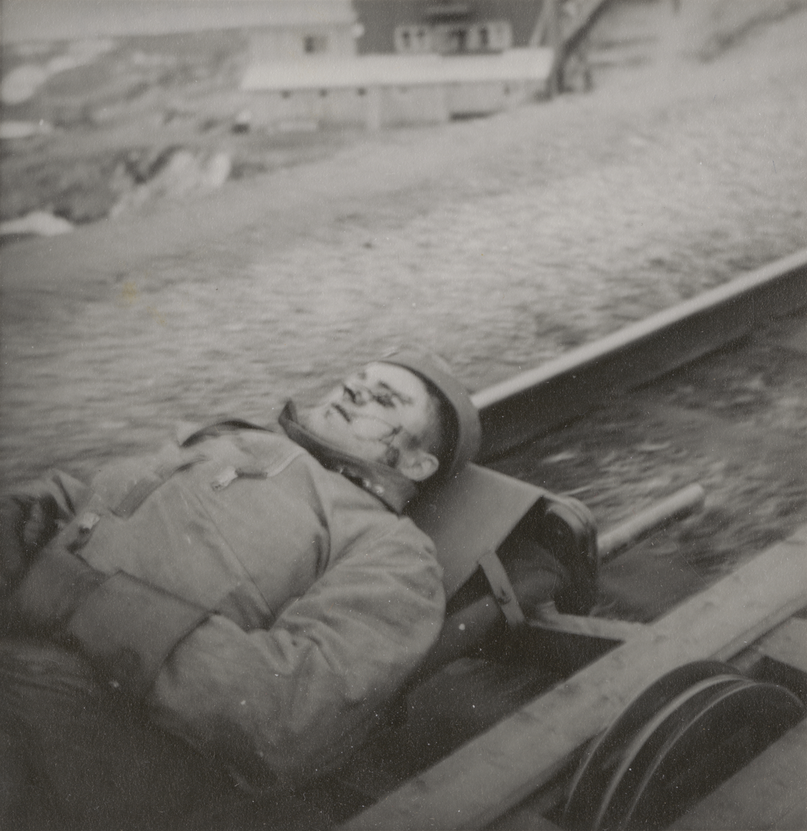 Titel: Skadad tysk transporteras på järnvägsspår. Foto ur anonym serie från beredskapen i Norrland.