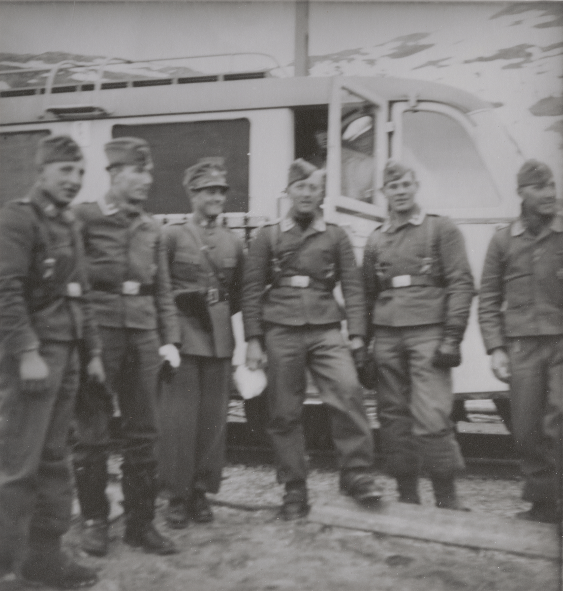 Titel: Sex soldater vid en buss på väg till Norge. Foto ur anonym serie från beredskapen i Norrland.