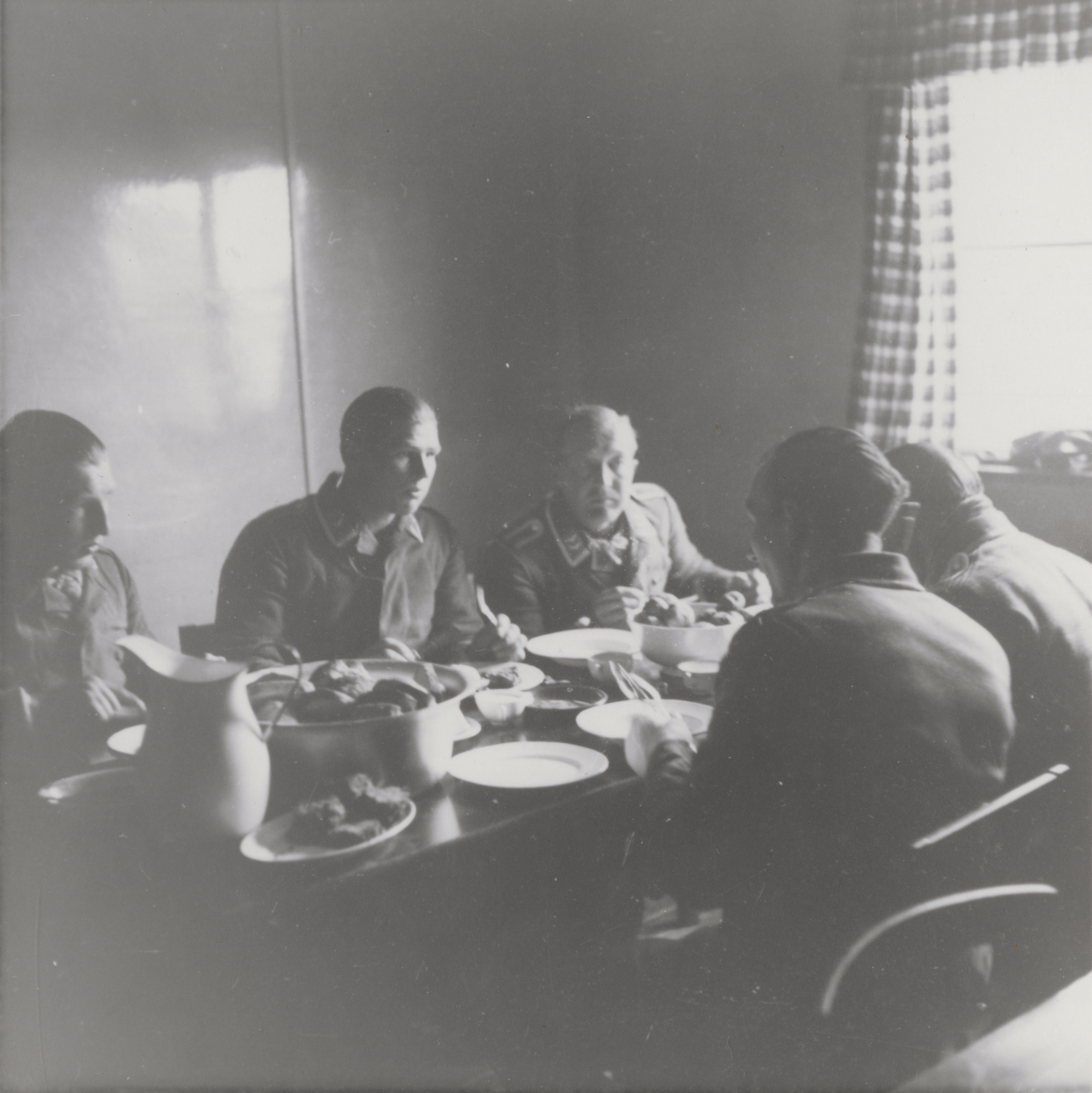 Titel: Måltid med tyska soldater som räddat sig med fallskärm. Foto ur anonym serie från beredskapen i Norrland.