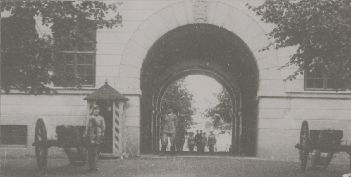 Valv till Upplands artilleriregementes kanslihus vid Polacksbacken, Uppsala, med vaktkur.