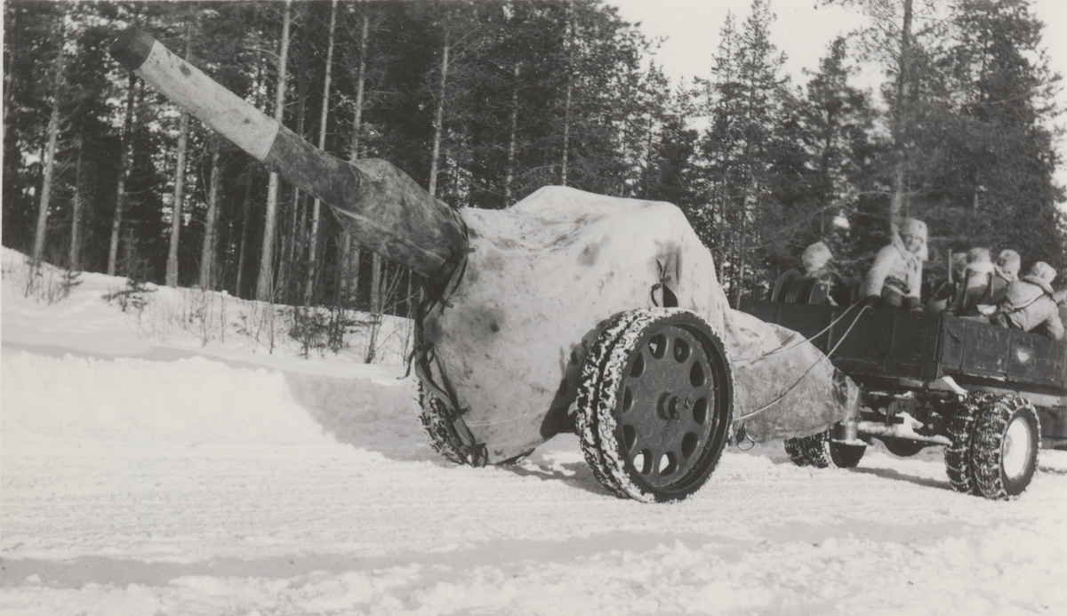 Övertäckt 10,5 cm kanon m/1934 dragen av en lastbil på snötäckt väg. Foto ur anonym serie från beredskapen i Norrland.