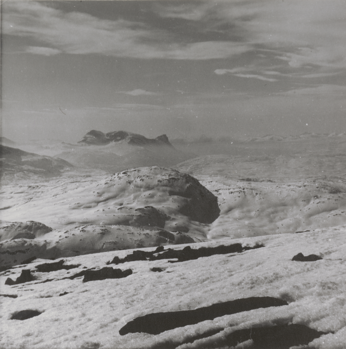 Snöklädda vidder. Enligt bildtext syns krutrök och brandrök från striderna vid Narvik. Foto ur anonym serie från beredskapen i Norrland.
