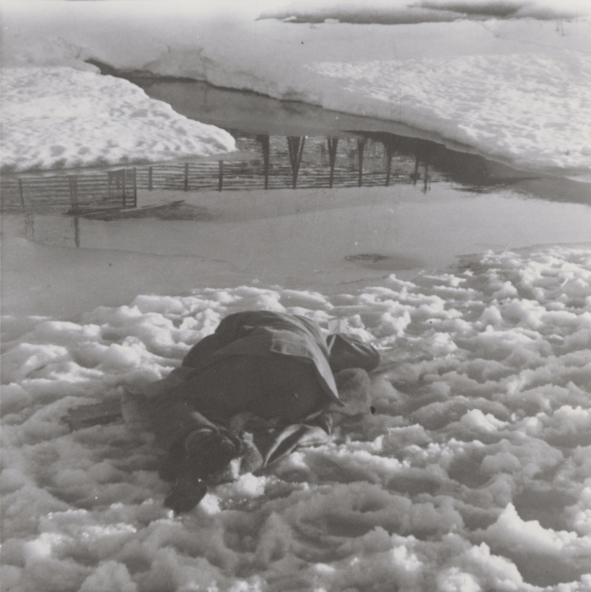Text bakom bilden: "Järnvägstjänsteman i Vassijaure skulle fiska med somnade på den medhavda renhuden". Foto ur anonym serie från beredskapen i Norrland.