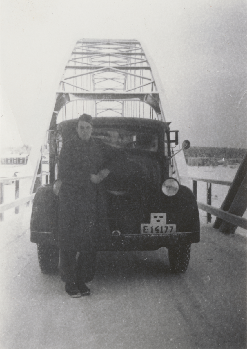 Lastbil med chaufför vid järnbro, beredskapstid, Övertorneå.