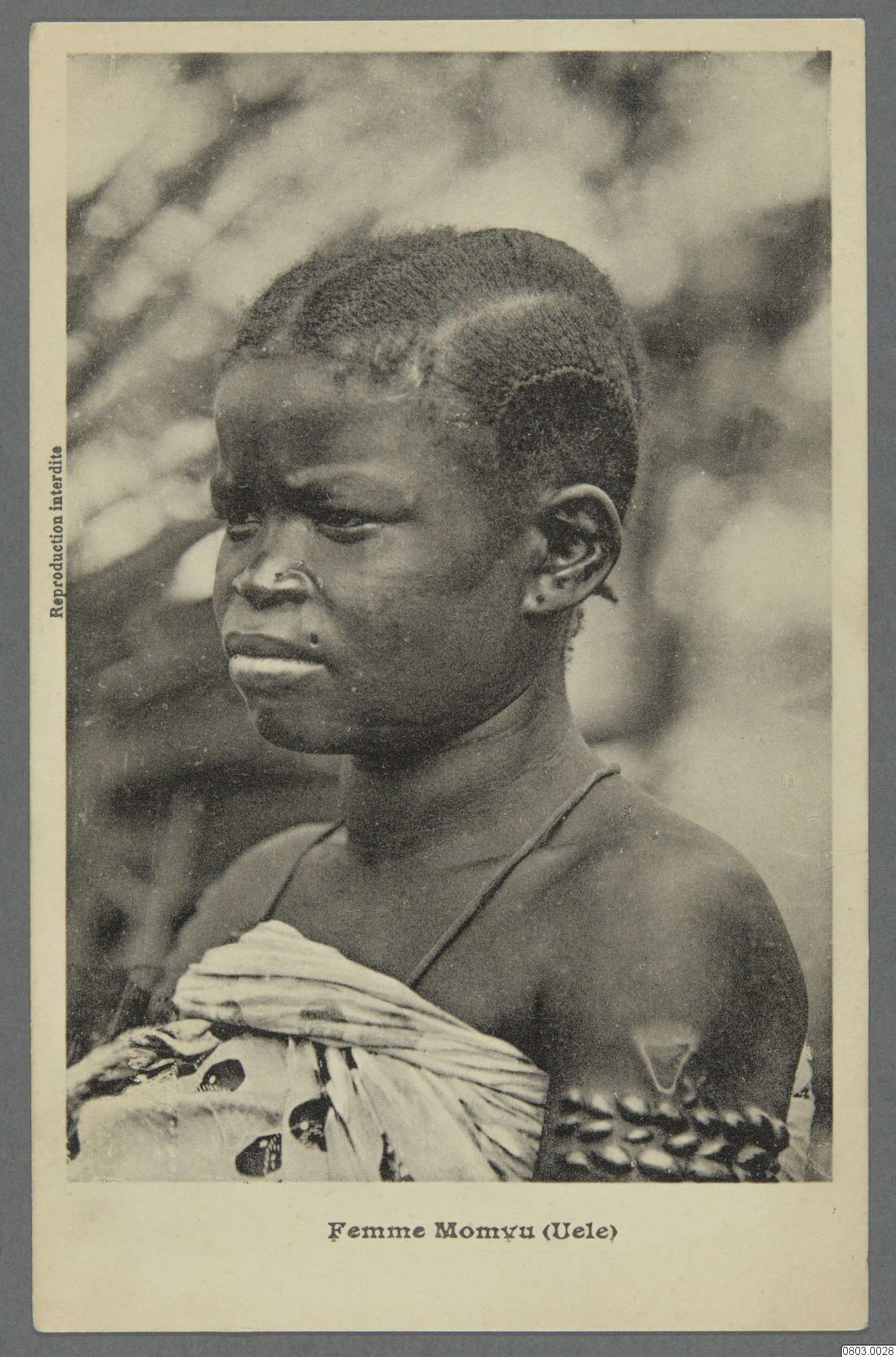 Vykort med ansiktporträtt av en kvinna. Text på framsida: "Femme Momvu (Uele) Reproduction interdite." Text på baksida: "Etat Independant du Congo. Carte Postale. Correspondance. Adresse"