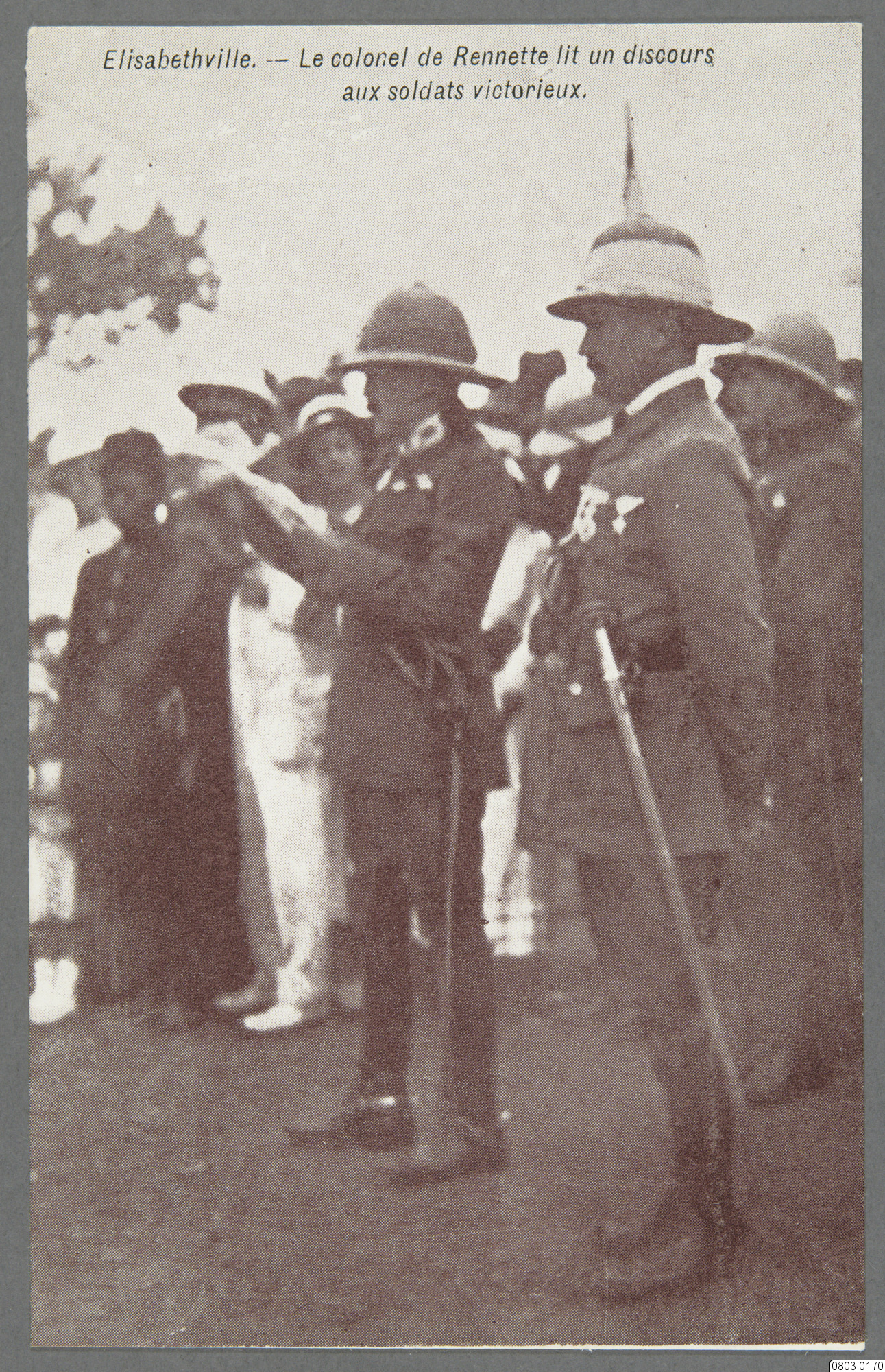 Vykort med motiv av överste Renette som läser ett tal för segerrika soldater. Text på framsida: "Elisabethville - Le colonel de Renette lit un discours aux soldats victorieux.". Text på baksida: "CARTE POSTALE."
