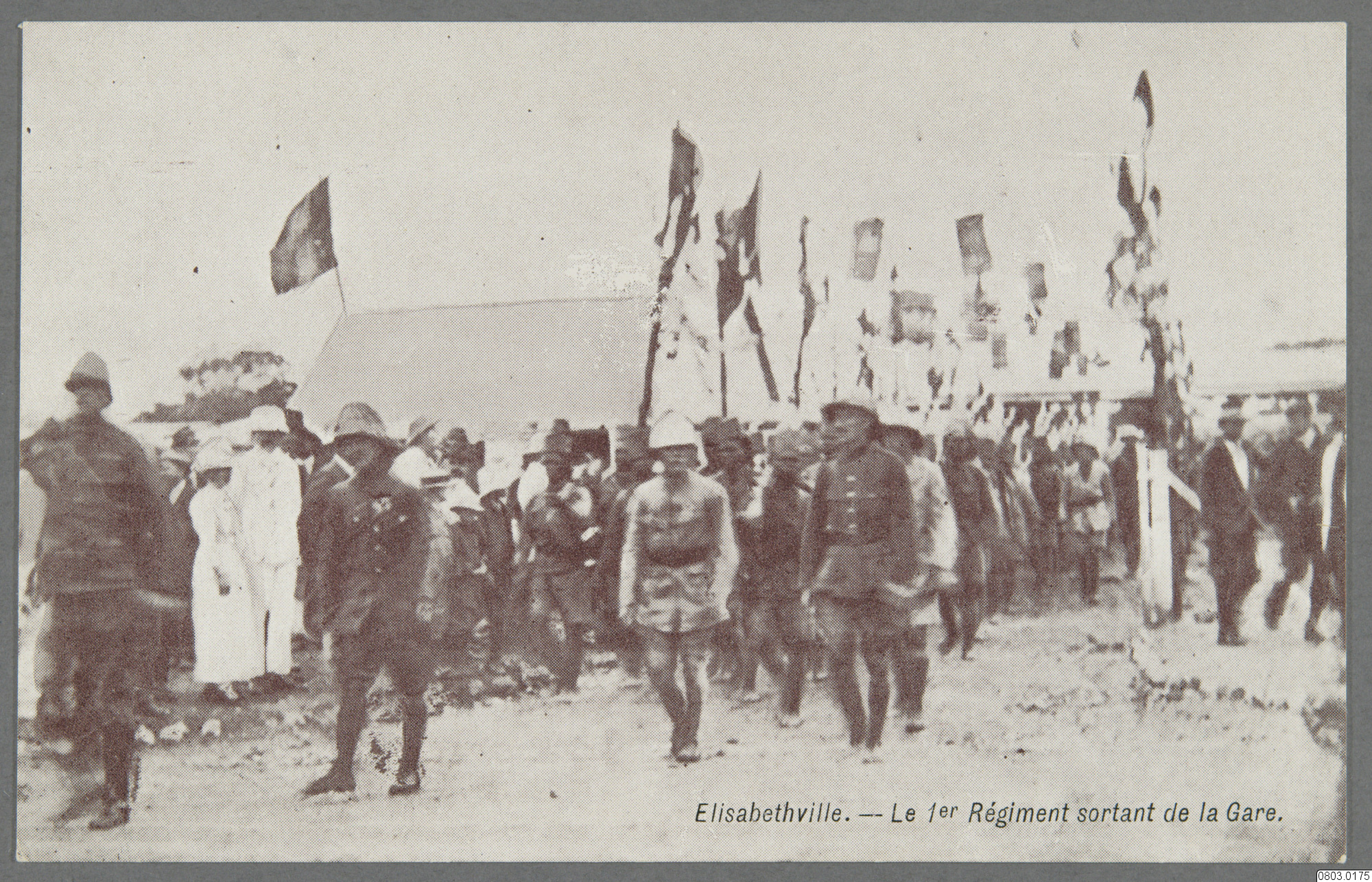 Vykort med motiv av 1:a Regementet lämnandes station i Lubumbashi. Män i uniform i förgrunden, flaggor och byggnader i bakgrunden. Text på framsida: "Elisabethville - Le 1er Regiment sortant de la Gare." Text på baksida: "CARTE POSTALE"