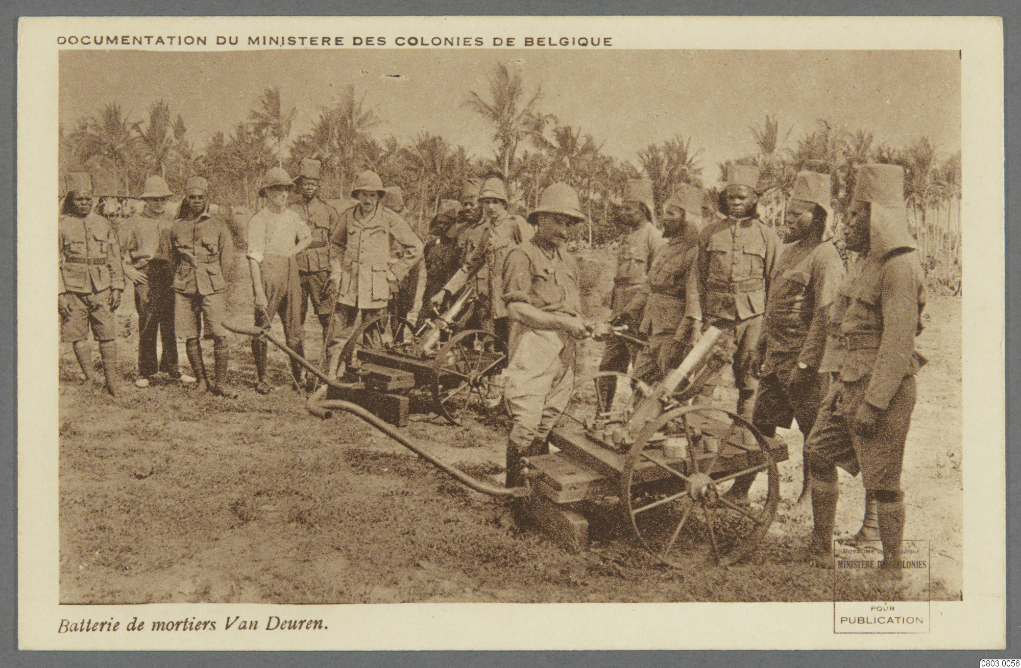 Vykort med motiv av grupp med män, civil- och uniformaklädda med kanoner, lavetter. Text på framsida: "Documentation du Ministere des Colonies de Belgique. Batterie de mortiers Van Deuren" Text på baksida: "Carte Postale, Publiée au bénéfice de l'œuvre; "Asiles des soldats invalides belges. Cabinet de Mr. le Ministre Vandervelde, Ste. Adresse, France (Seine Inférieure). Côte réservé à l'adresse."
