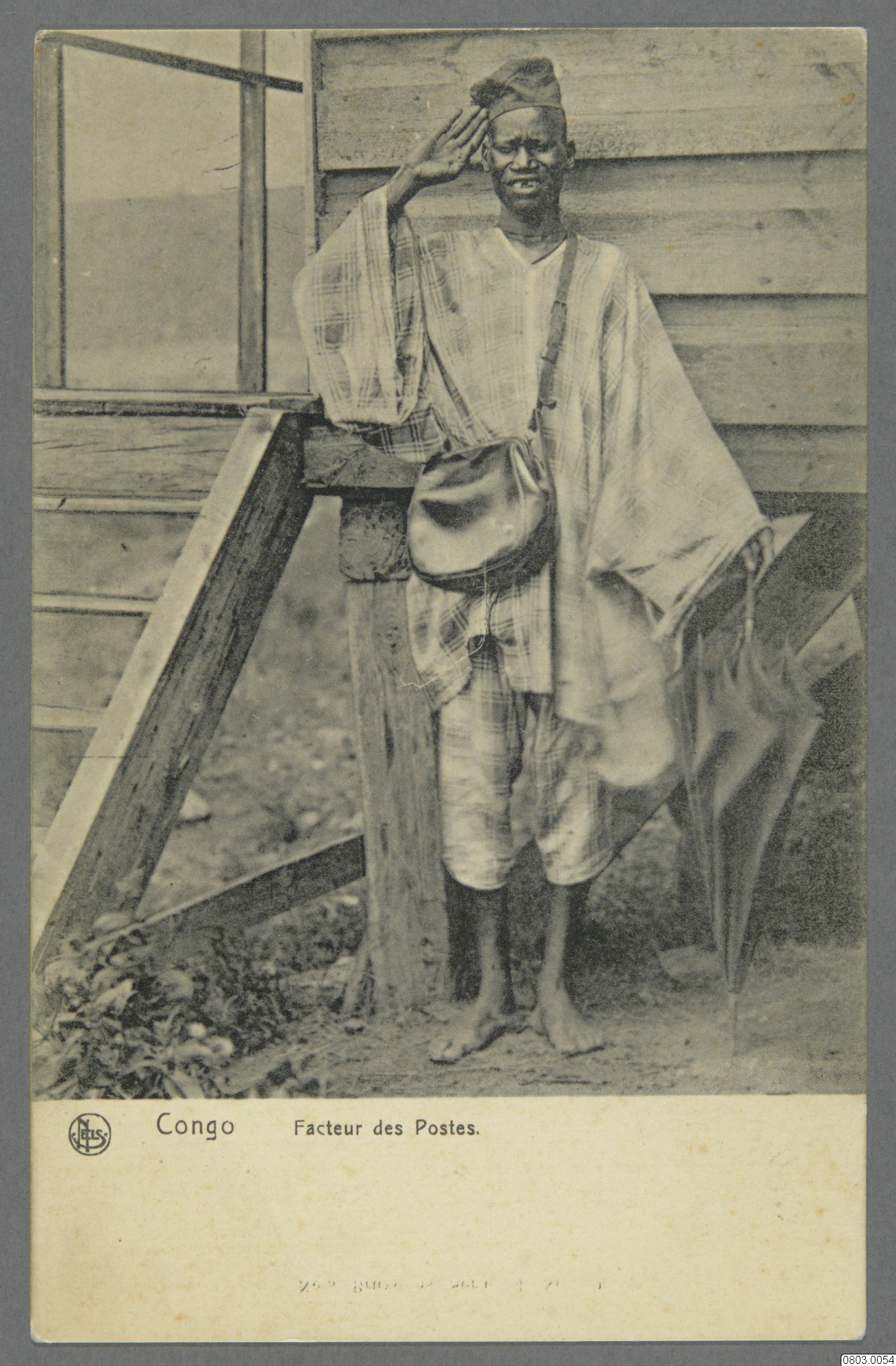 Vykort med porträtt av en man, postiljon med väska och paraply, som gör honör. Text på framsida: "Congo. Facteur des postes" Text på baksida: "Carte Postale, Correspondance, Adresse, Ed. Nels, Bruxelles. Serie 14 No. 115. "