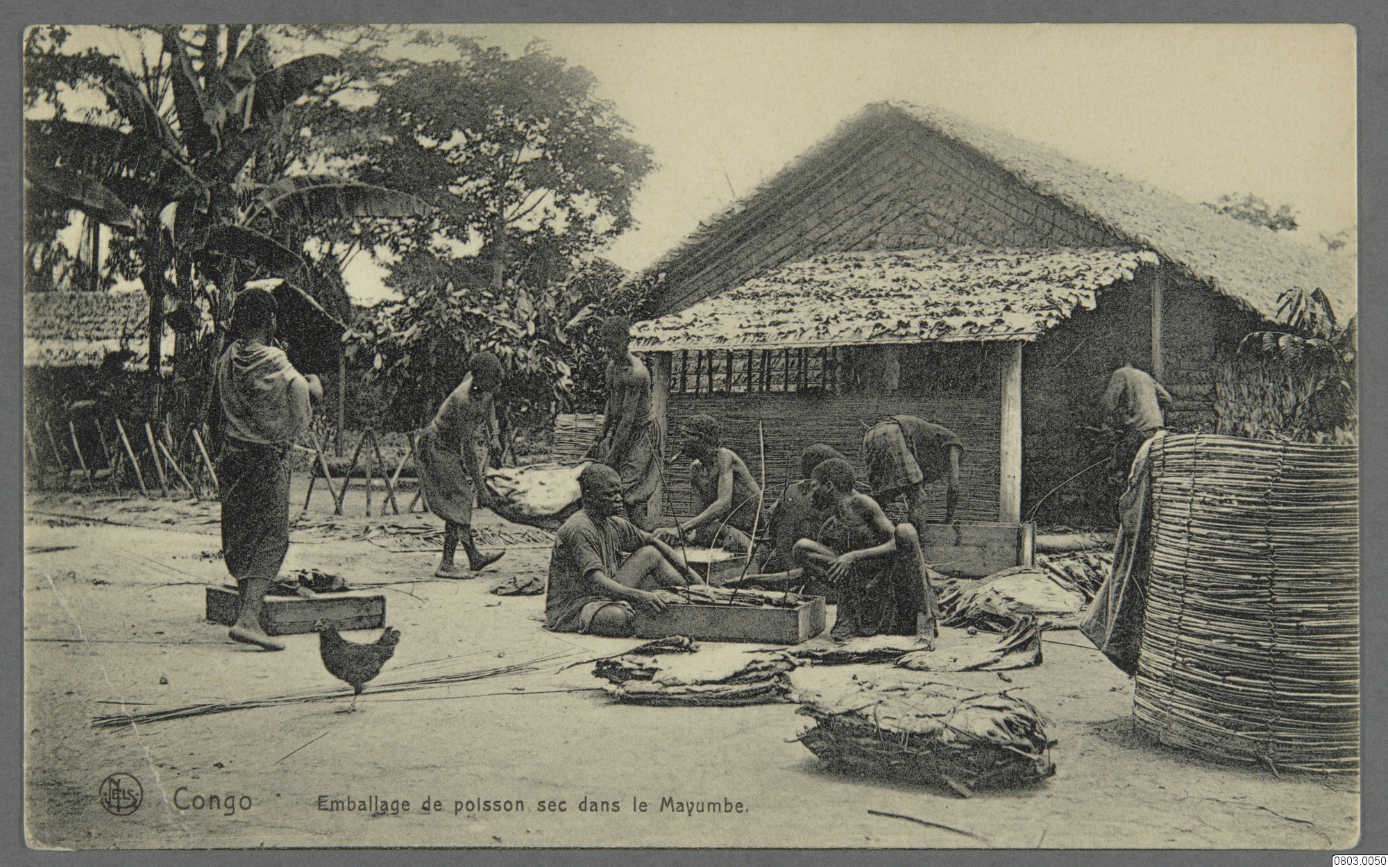 Vykort med motiv av arbete med och paketering av torkad fisk. Text på framsida: "Congo. Emballage de poisson sec dans le Mayumbe" Text på baksida: "Carte Postale, Correspondance, Adresse, Ed. Nels, Bruxelles. Serie 14 No. 21. "