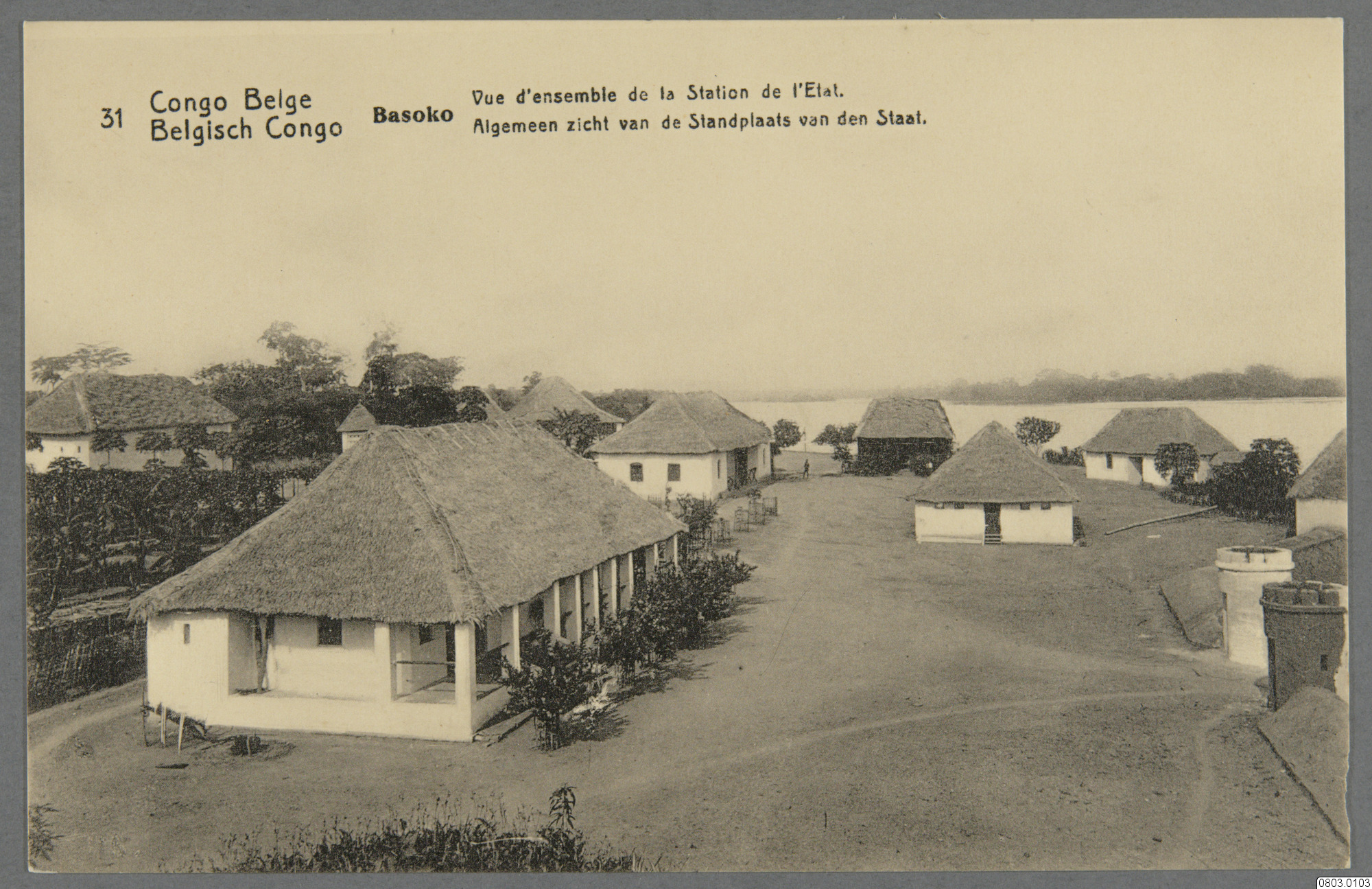 Vykort med motiv av statens station. Text på framsida: "Congo Belge, Belgisch Congo, Basoko, Due d'ensamble de la Station de I'Etat, Algemeen zicht van de Standplaats van den staat." Text på baksida: " Congo Belge, Belgisch Congo, Carte Postale, Postkaart, Correspondance, Briefwisseling, Adresse, Adres."