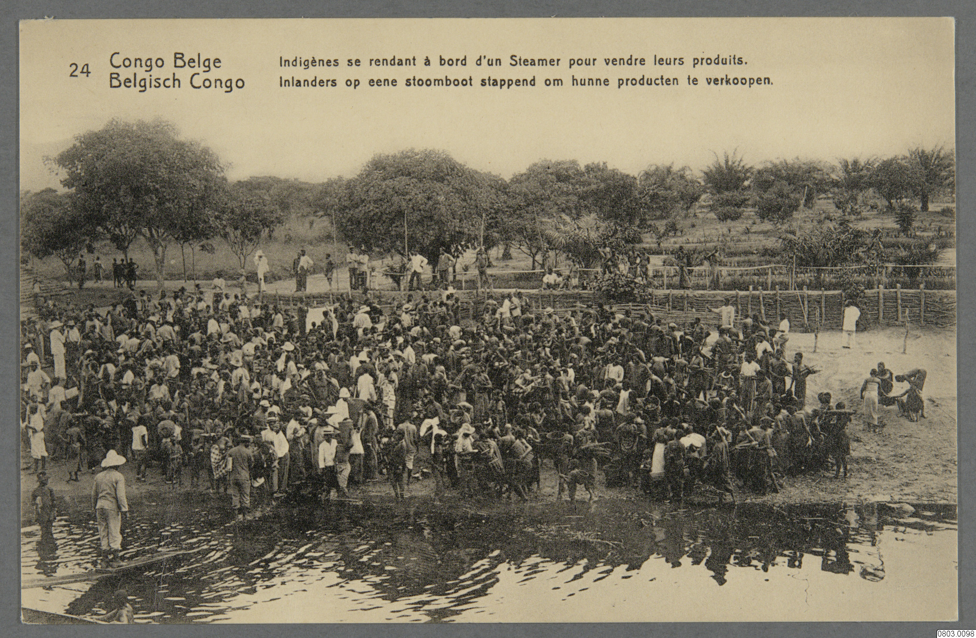 Vykort med motiv av ombordstigning på ångbåt, urinvånare ska iväg och sälja sina varor. Text på framsida: "Congo Belge, Belgisch Congo, Indégenes se rendant á bord de un Steamer pour vendre leurs produits, Inlanders op eene stoomboot stappend om hunne producten te verkoopen." Text på baksida: "Congo Belge, Belgisch Congo, Carte Postale, Postkaart, Correspondance, Briefwisseling, Adresse, Adres."