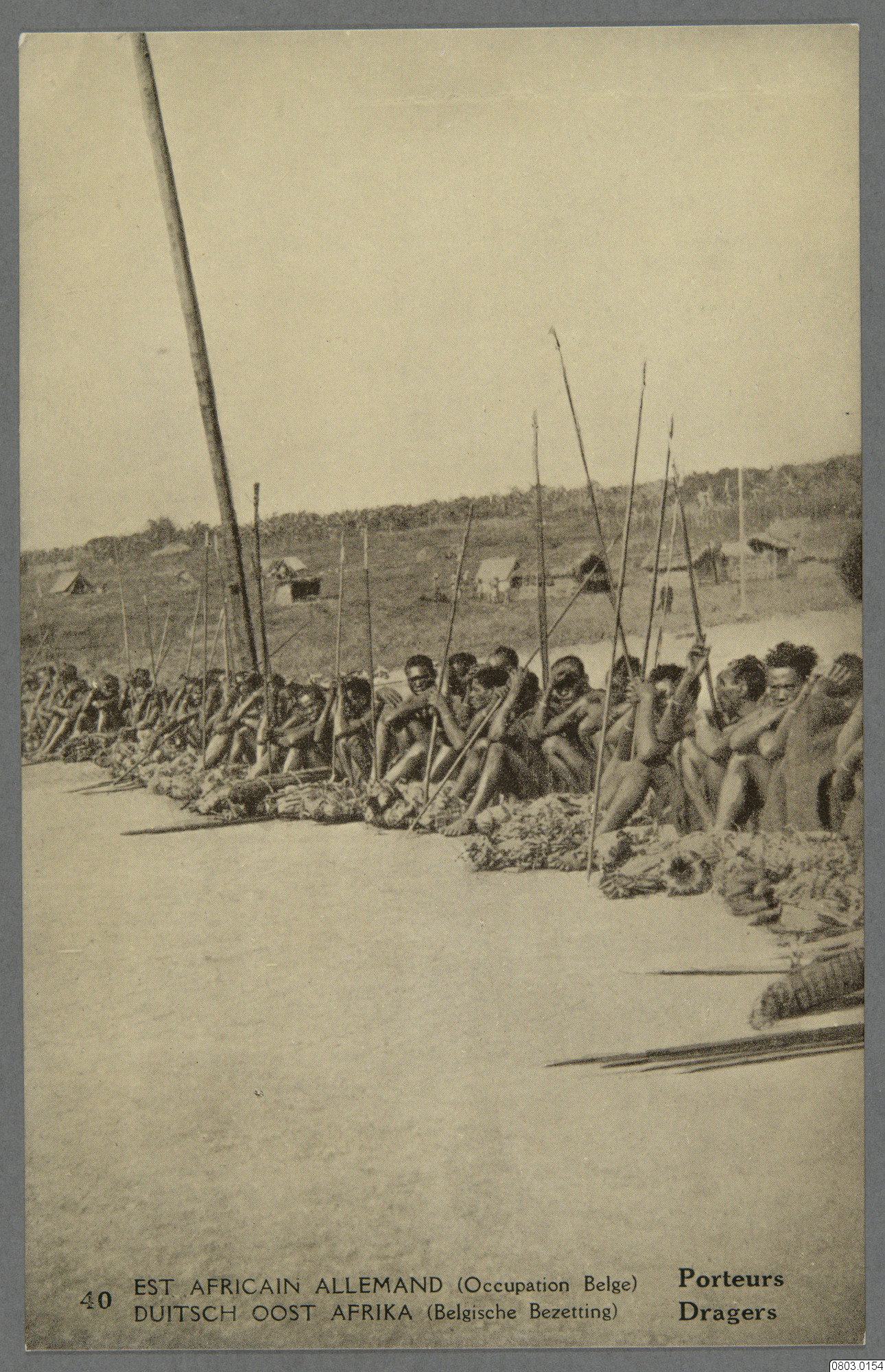 Vykort med motiv av spjutbärare sittandes på rad, urinvånare. Text på framsida: "Est Africain Allemand (Occupation Belge), Dutsch Oost Afrika (Belgische Bezetting), Porteurs, Dragers." Text på baksida: "Congo Belge, Belgisch Congo, Carte Postale, Postkaart, Correspondance, Briefwisseling, Adresse, Adres. Waterlow & Sons Limited, Londres, Angleterre."