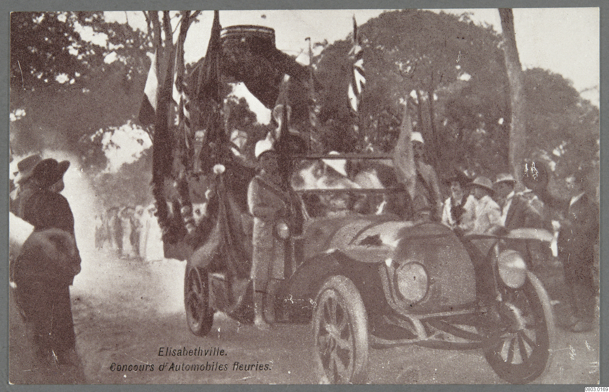 Vykort med motiv av biltävling i Lubumbashi, publik längs kanterna, flaggor på bilen. Text på framsida: "Elisabethville, Concours d' Automobiles fleuries." Text på baksida: "CARTE POSTALE."