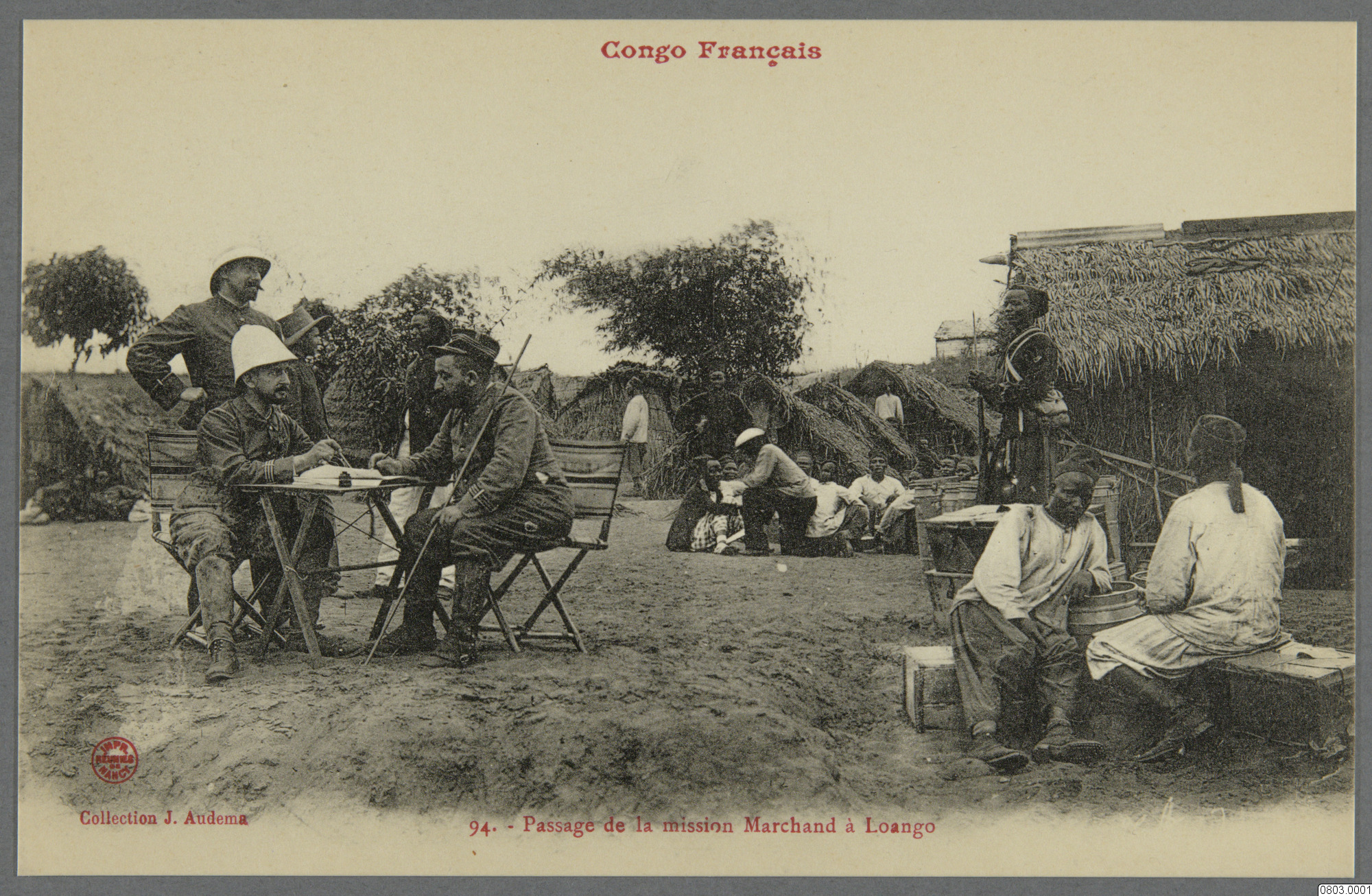 Vykort med motiv av samlingsplats bland hyddo, bostäder, uniformsklädda och civilklädda människor. Text på framsida: " Congo Francais, 94. Pasage de la mission Marchand á Loango. Collection J. Audema" Text på baksida: "Carte Postale. Correspondance. Adresse"