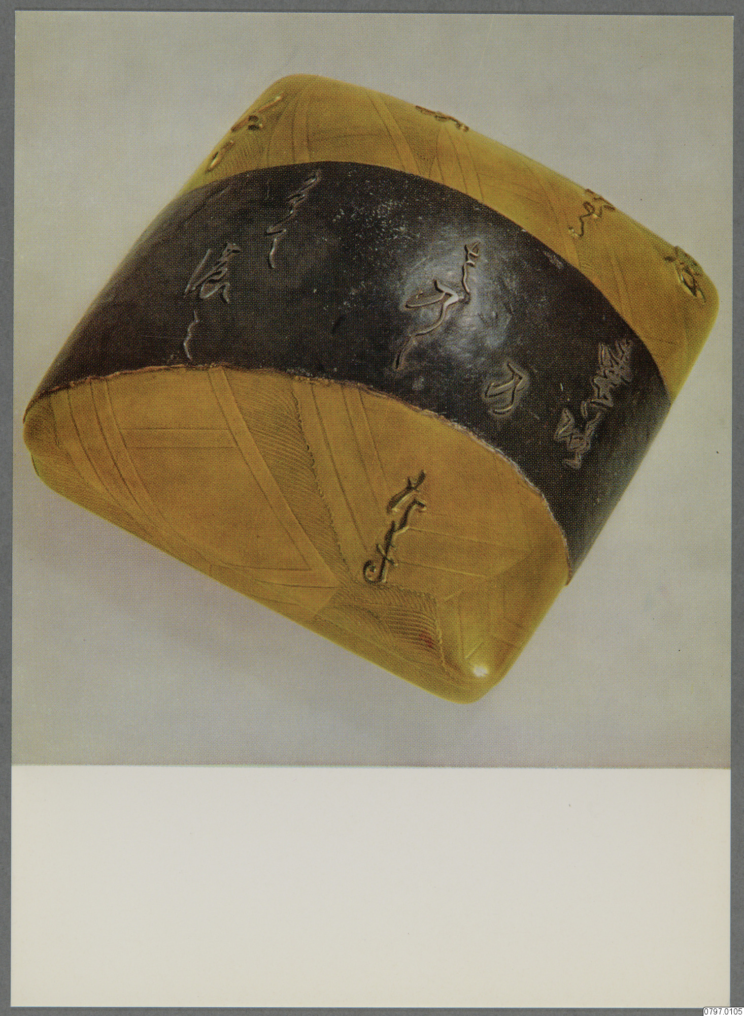 Vykort med motiv av kuddformad låda med ett mörkt band över mitten, randigt mönster och utbuktande skrift, guldlackerad skriftlåda med "pontonbrygga"-design av Hon'ami Kõetsu. Edoperioden, Japan. Text på baksida: "Text på Japanska, Writing box with design of pontoons in maki-e (gold-lacquer) and inlay. By Honnami Kôetsu (1558-1637). Edo Period, POST CARD, Text på Japanska, Printed and Published by BENRIDO, Tokyo - Kyoto, Edited by TOKYO NATIONAL MUSEUM."