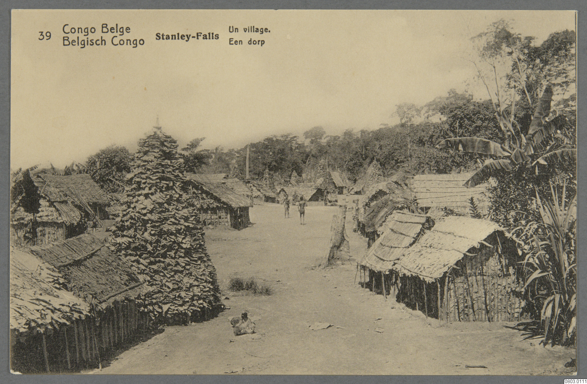 Vykort med motiv av by nära Boyomafallen. Text på framsida: "Congo Belge, Belgisch Congo, Stanley-falls, Un village, Een dorp." Text på baksida: "Congo Belge, Belgisch Congo, Carte Postale, Postkaart, Correspondance, Briefwisseling, Adresse, Adres."