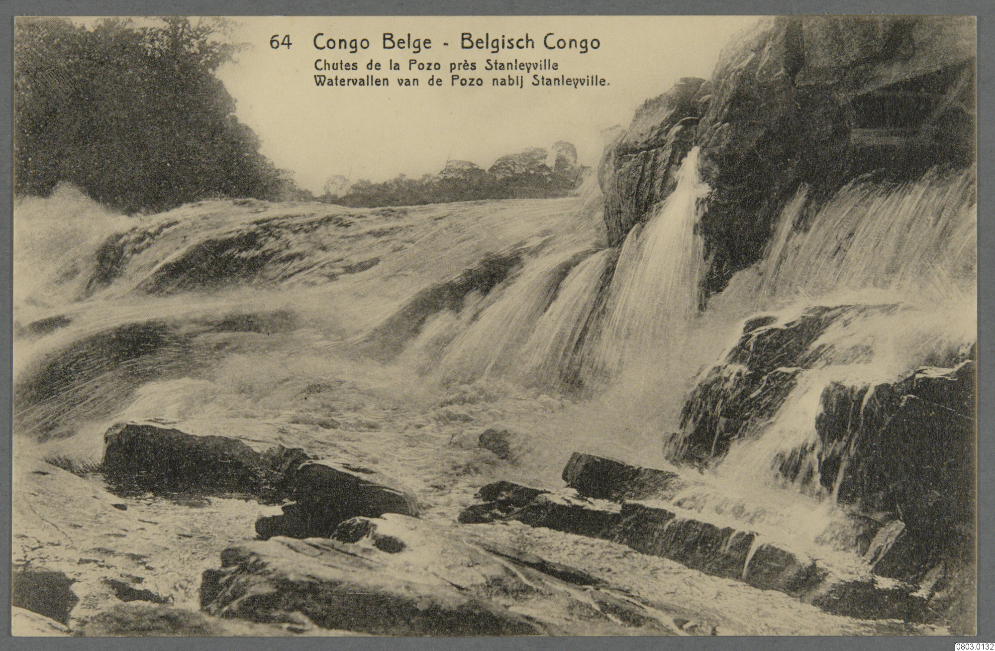 Vykort med motiv av vattenfall Pozo nära Kisangi. Text på framsida: "Congo Belge, Belgisch Congo, Chutes de la Pozo préz Stanleyville, Watervallen van de Pozo nabij Stanleyville." Text på baksida: "Congo Belge, Belgisch Congo, Carte Postale, Postkaart, Correspondance, Briefwisseling, Adresse, Adres."