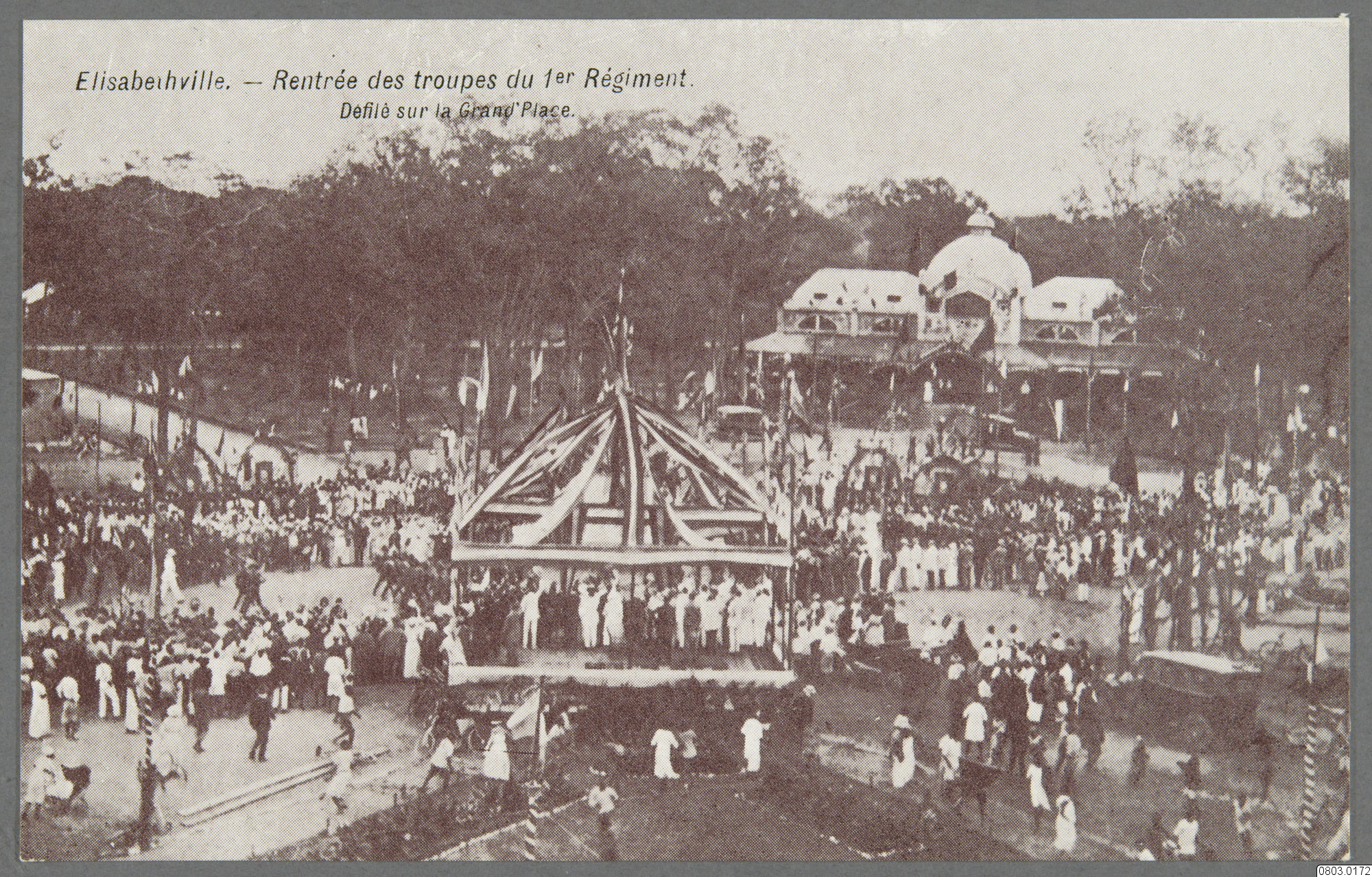 Vykort med motiv av trupper från 1:a Regementets återkomst, parad på Grand' Place i Lubumbashi. Text på framsida: "Elisabethville - Rentrée des troupes du 1er Régiment. Defíle sur la Grand' Place." Text på baksida: "CARTE POSTALE".