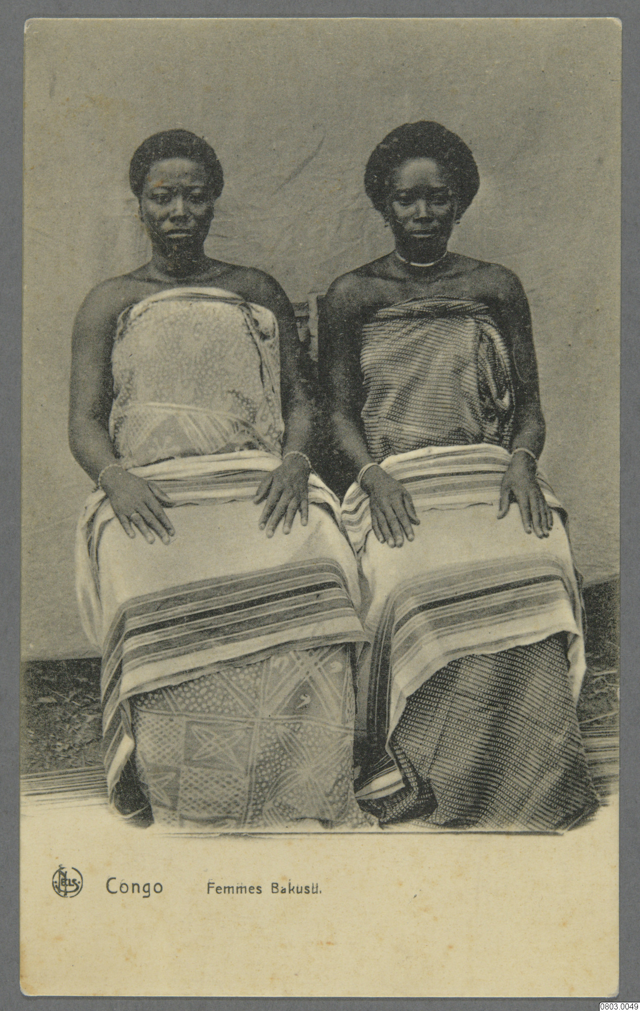 Vykort med porträtt av två sittande kvinnor. Text på framsida: "Congo. Femmes Bakusü" Text på baksida: "Carte Postale, Correspondance, Adresse, Ed. Nels, Bruxelles. Serie 14 No. 11."