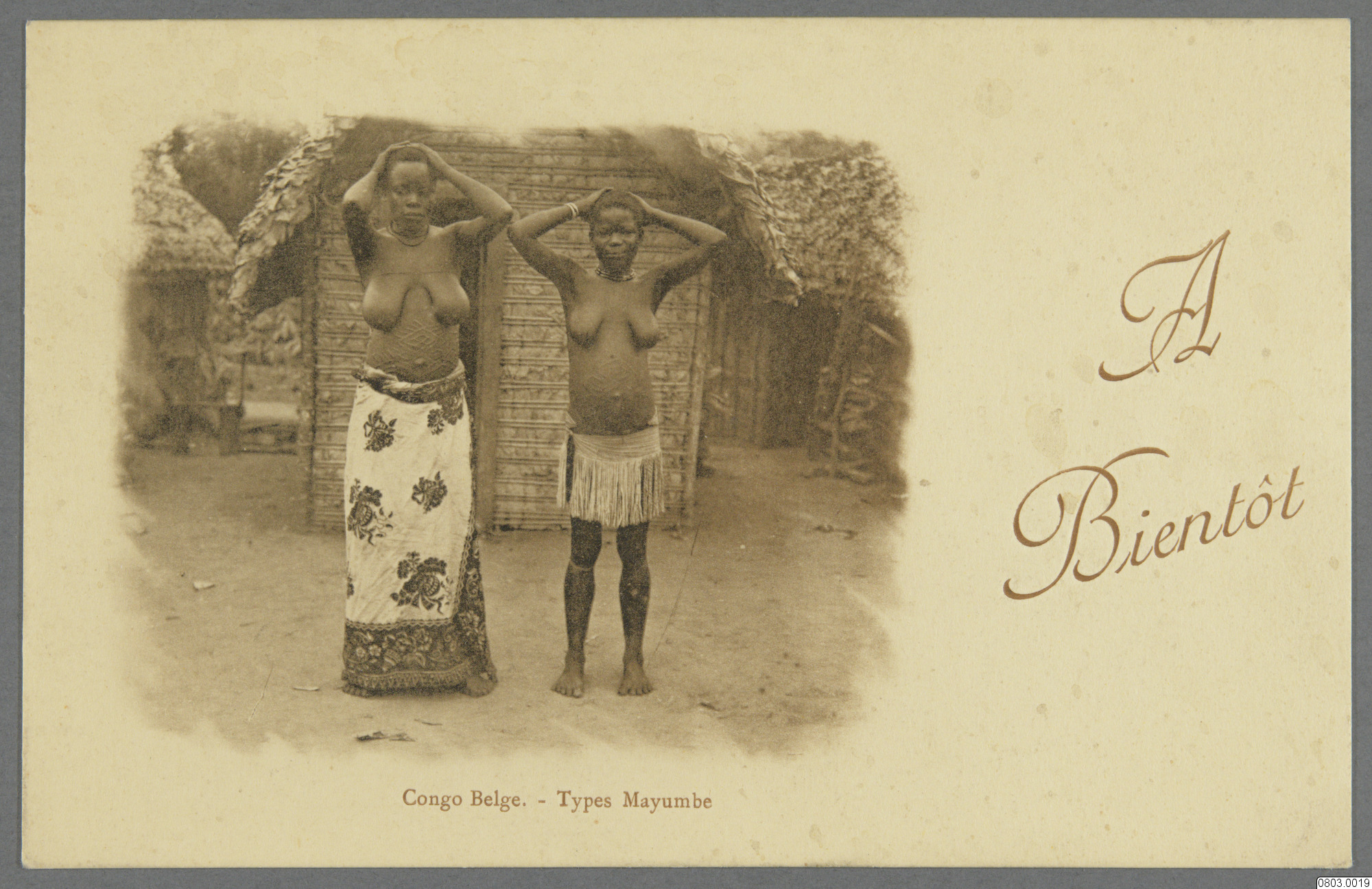 Vykort med motiv av två kvinnor framför ett hus, de håller händerna på huvudet. Text på framsida: "Congo Belge. Types Mayumbe. A Bientôt." Text på baksida: "Congo Belge. Carte Postale. Correspondance. Adresse"