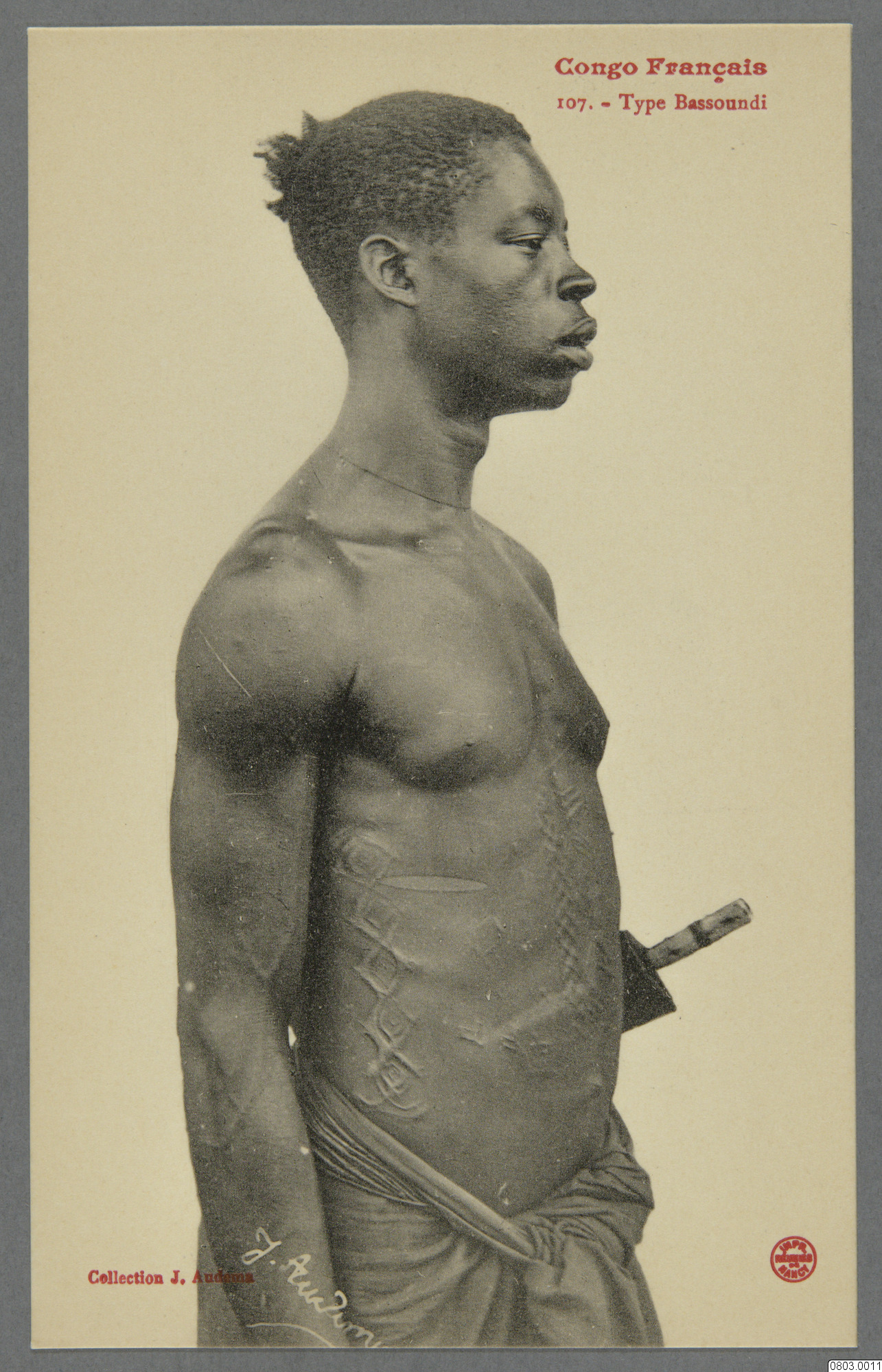 Vykort med porträtt av en man. Text på framsida: "Congo Francais. 107. Type Bassoundi. Collection J. Audema." Text på baksida: "Carte Postale. Correspondance. Adresse"