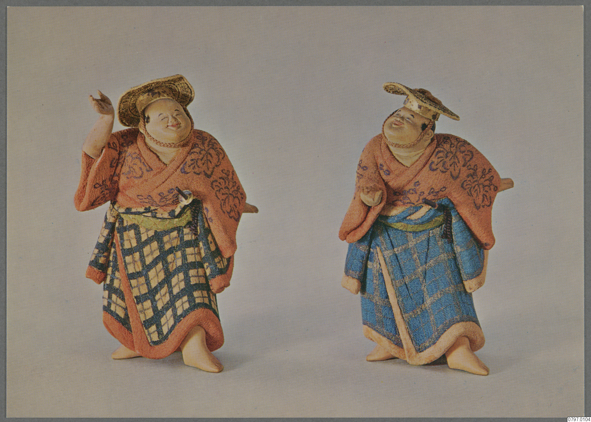 Vykort med motiv av två leende figurer i orange, blå - och gulfärgade kläder med svarta detaljer, Kamo ningyõdockor i trä med textil fastlimmat i träet. Japan. Text på baksida: "Text på Japanska, Kamo ningyõ owned by Yõmeibunko, POST CARD, Text på Japanska."