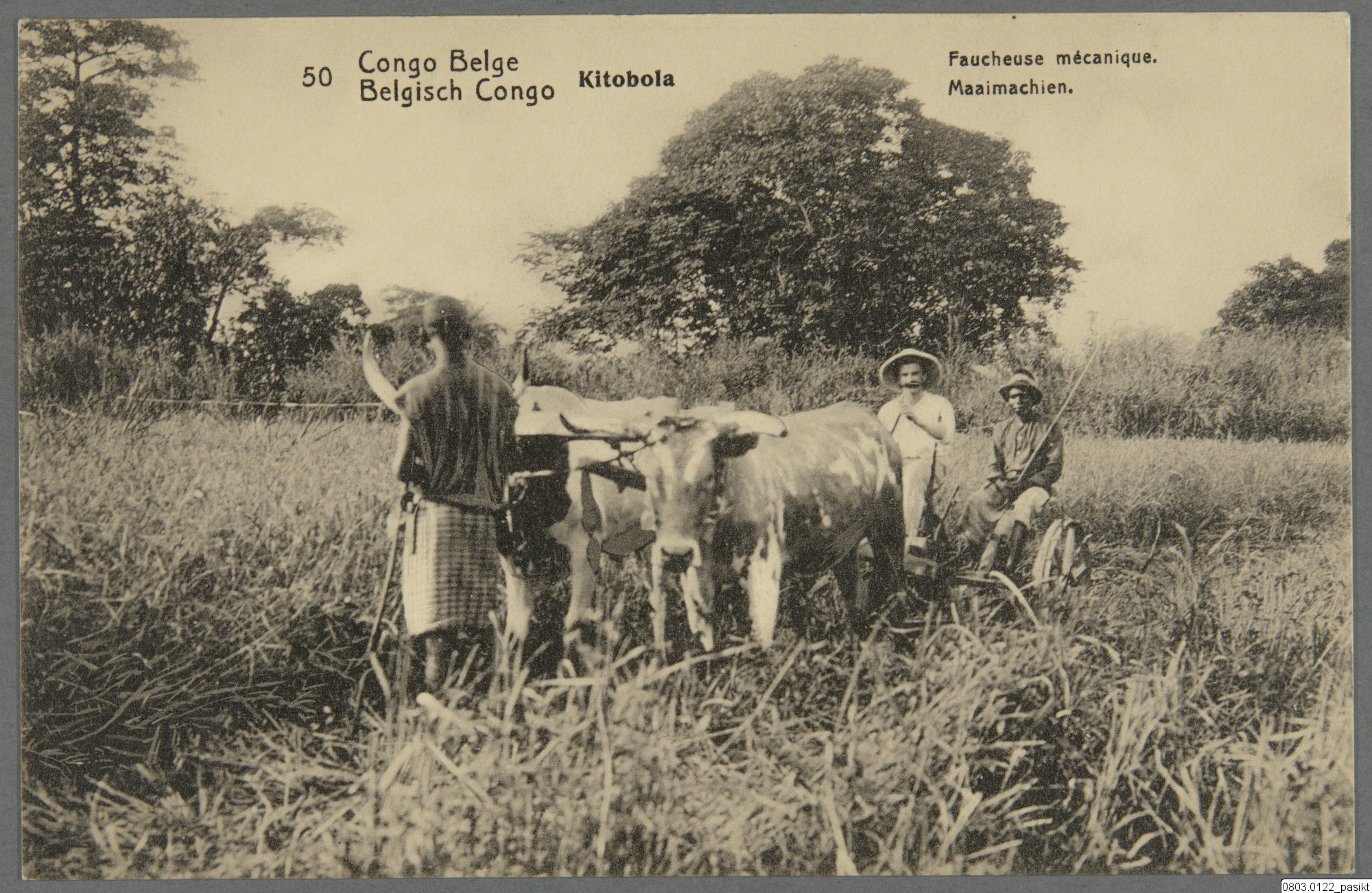 Vykort med motiv av män som brukar ett skördefält med hjälp av nötkreatur. Text på framsida: "Congo Belge, Belgisch Congo, Kitobola, Faucheuse mécanique, Maaimachien." Text på baksida: "Congo Belge, Belgisch Congo, Carte Postale, Postkaart, Correspondance, Briefwisseling, Adresse, Adres."
