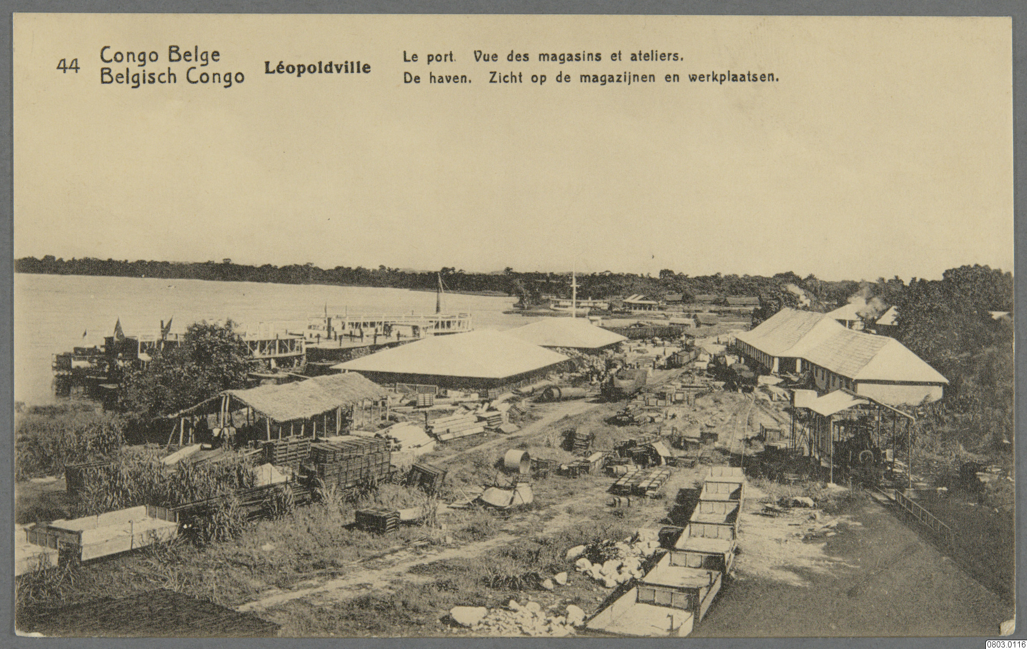 Vykort med vy över hamn, butiker och verkstäder i Kinshasa. Text på framsida: "Congo Belge, Belgisch Congo, Léopoldville, Le port, vue des magasins et atiliers, De haven, Zicht op de magazijnen en werkplaatsen." Text på baksida: "Congo Belge, Belgisch Congo, Carte Postale, Postkaart, Correspondance, Briefwisseling, Adresse, Adres."