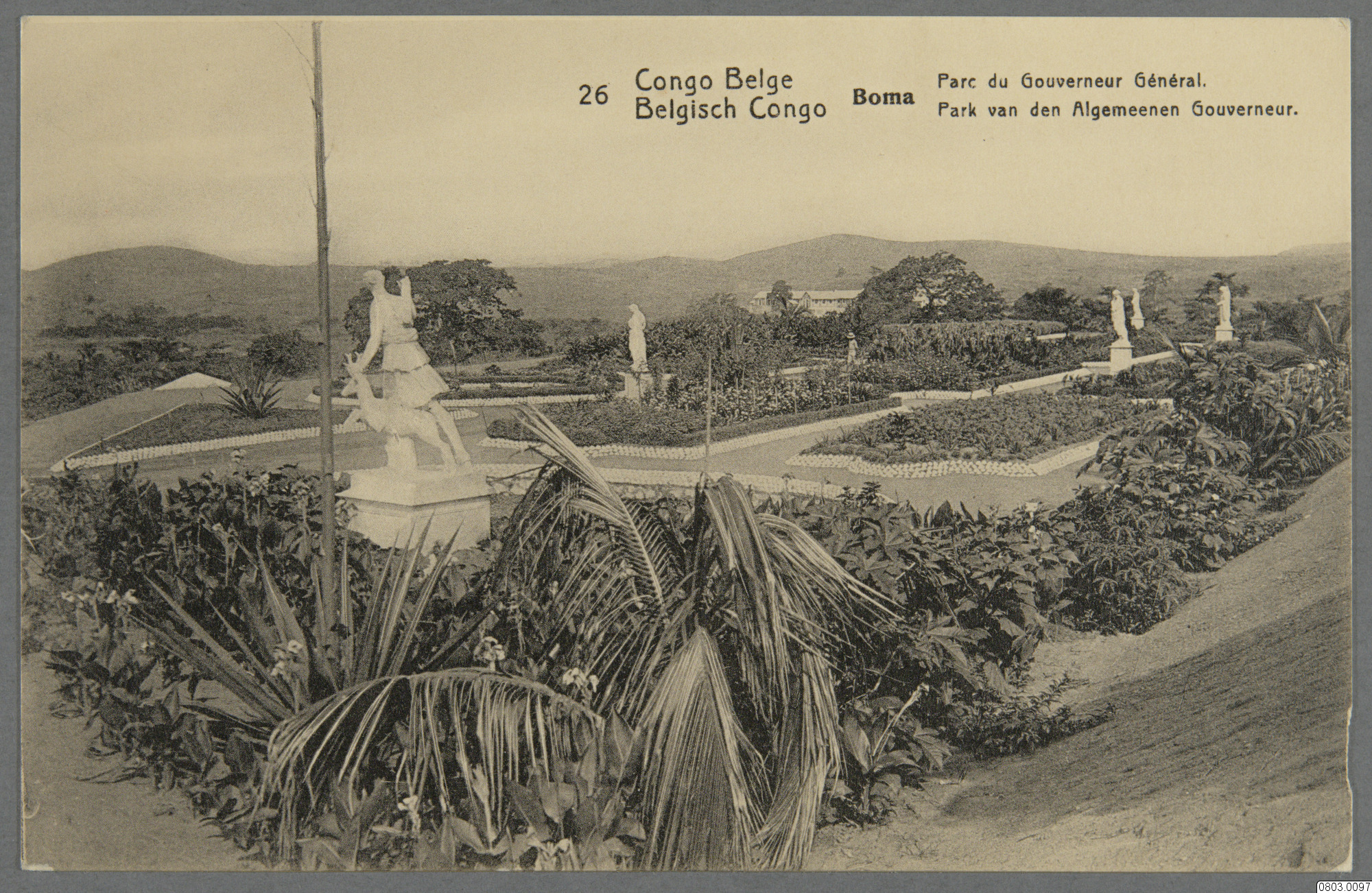 Vykort med motiv av Generalguvernörens park i Boma. Text på framsida: "Congo Belge, Belgisch Congo, Boma, Parc du Gouverneur Génerál, Park van den Algemeenen Gouverneur. Text på baksida: "Congo Belge, Belgisch Congo, Carte Postale, Postkaart, Correspondance, Briefwisseling, Adresse, Adres."