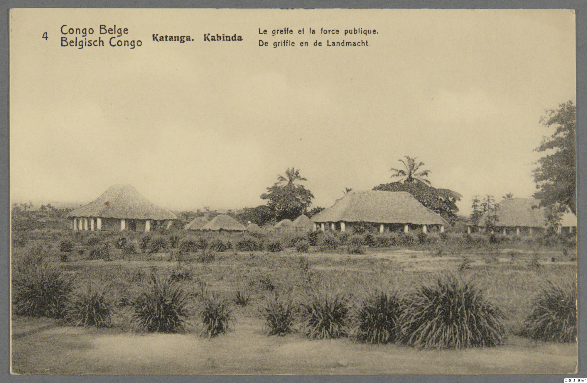 Vykort med motiv av anläggning för militär verksamhet. Text på framsida: "Congo Belge, Belgisch Congo, Katanga. Kabinda. Le greffe et la force publique. De griffie en de Landmacht." Text på baksida: "Congo Belge, Belgisch Congo, Carte Postale, Postkaart, Correspondance, Briefwisseling, Adresse, Adres."