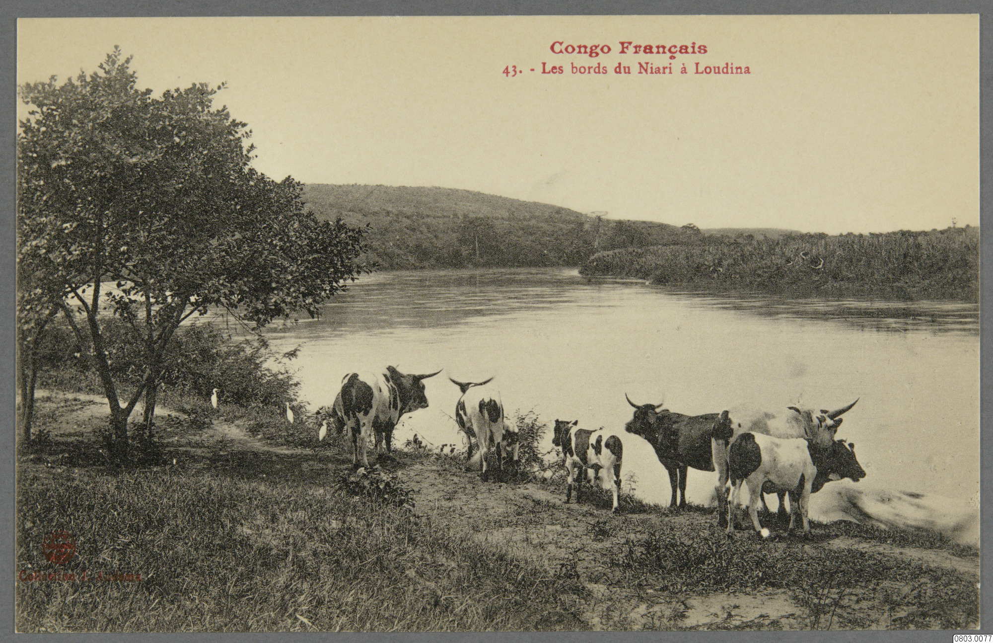 Vykort med motiv av flock med boskap vid flod, strandkant. Text på framsida: "Les bords du Niari à Loudina." Text på baksida: "Carte Postale, Correspondance, Adresse."