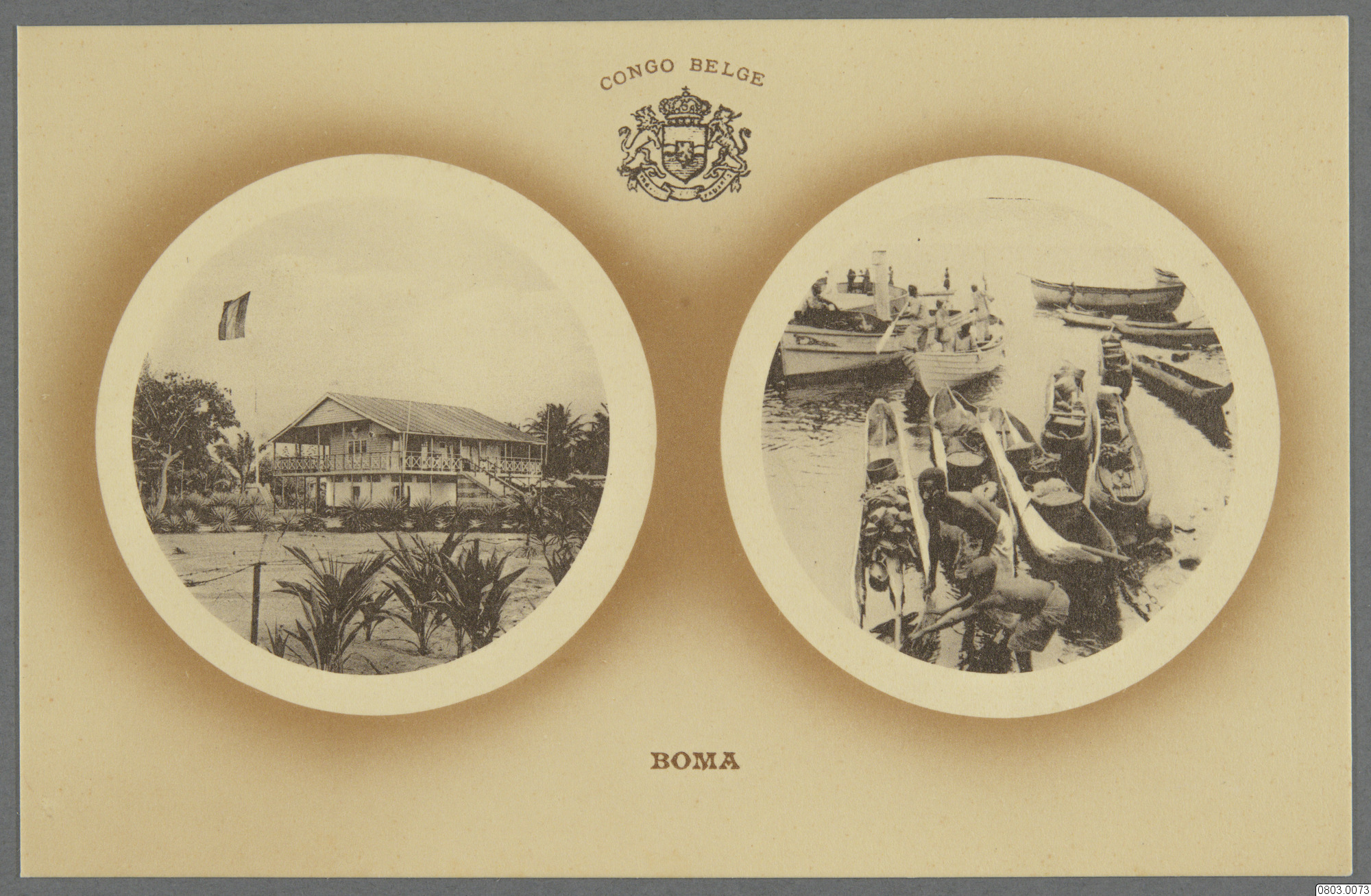 Vykort med motiv av två runda bilder från Boma, Kongo, hus och båtar. Text på framsida: "Congo Belge. Boma." Text på baksida: "Carte Postale, Publiée au bénéfice de l'œuvre; "Asiles des soldats invalides Belges. Cabinet de Mr. le Ministre Vandervelde, Ste. Adresse, France (Seine Inférieure). Côte réservé à l'adresse."